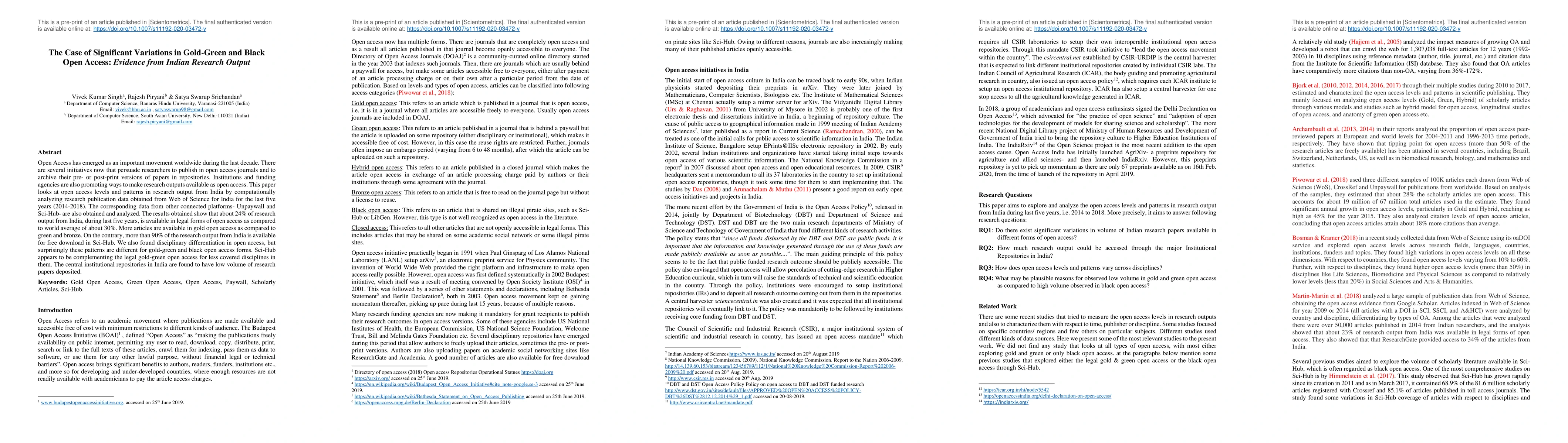 This study analyzes open access publication trends in Indian research from 2014-2018, revealing that only 24% of Indian research is legally open access compared to a global average of 30%. Despite this, over 90% of Indian research is freely accessible via Sci-Hub, highlighting significant disciplinary variations in gold-green and black open access.