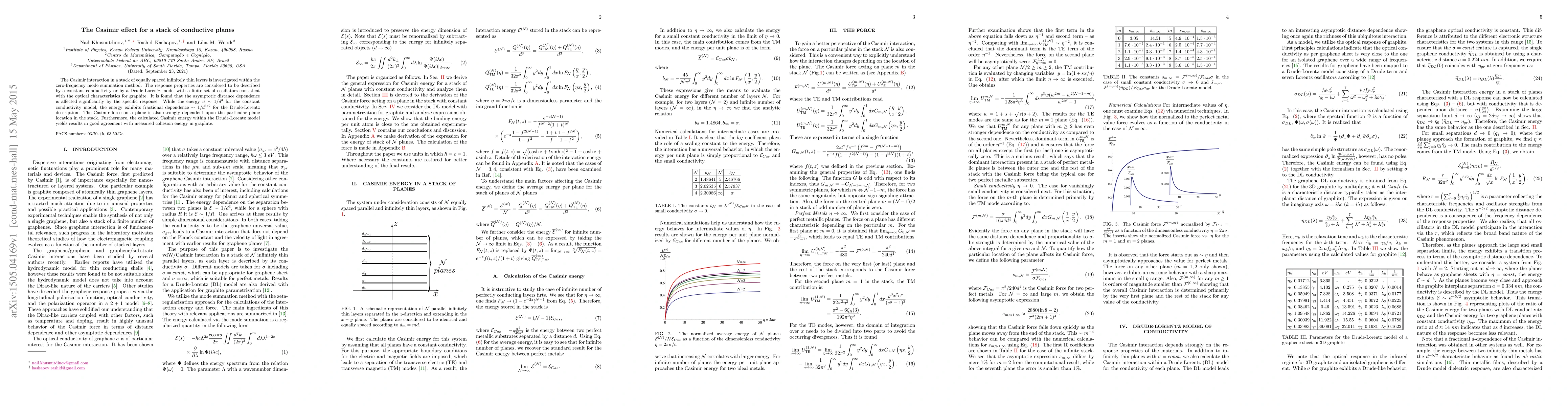 The research examines the Casimir effect on stacks of conductive planes, finding that the energy dependence on distance varies significantly based on the response model—constant conductivity yields 1/d³, while Drude-Lorentz model gives 1/d^(5/2). Casimir force on individual planes is influenced by their position in the stack, and the Drude-Lorentz model aligns with measured cohesion energy in graphite.