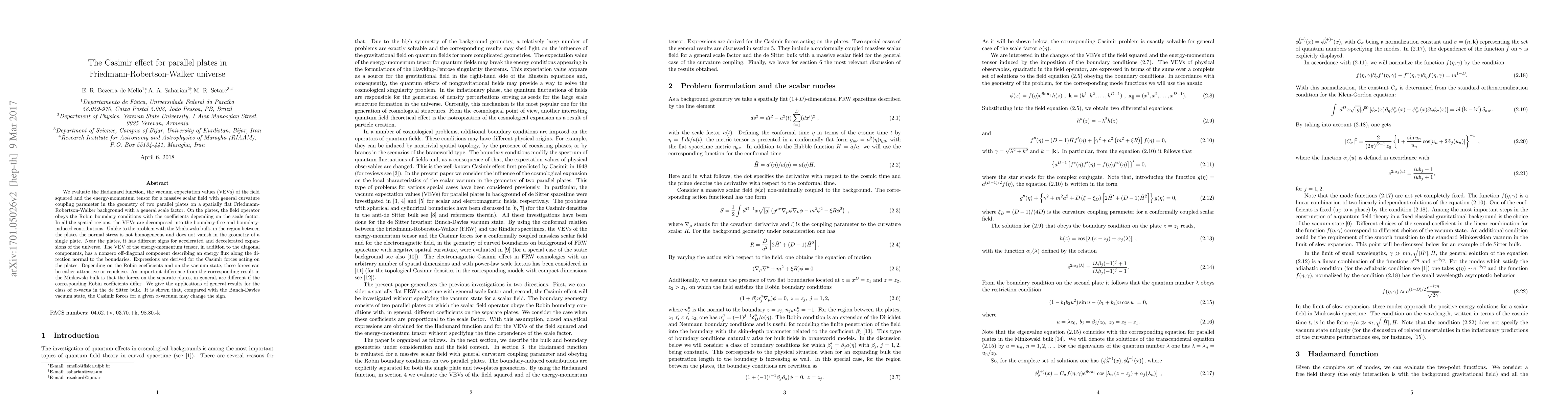 This paper evaluates the Casimir effect for parallel plates in a Friedmann-Robertson-Walker universe, deriving expressions for the vacuum expectation values and energy-momentum tensor for a massive scalar field. The study reveals that the normal stress between plates is non-homogeneous and varies with the universe's expansion rate, leading to different Casimir forces depending on the Robin coefficients and vacuum state.
