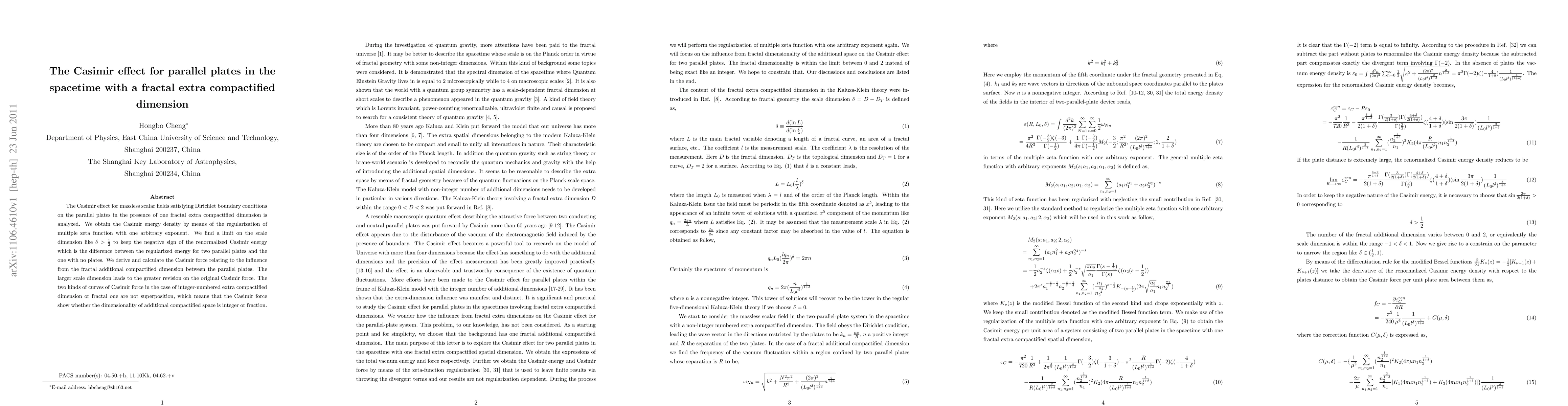 The Casimir effect for massless scalar fields satisfying Dirichlet boundary conditions on the parallel plates in the presence of one fractal extra compactified dimension is analyzed. We obtain the Casimir energy density by means of the regularization of multiple zeta function with one arbitrary exponent. We find a limit on the scale dimension like $\delta>1/2$ to keep the negative sign of the renormalized Casimir energy which is the difference between the regularized energy for two parallel plates and the one with no plates. We derive and calculate the Casimir force relating to the influence from the fractal additional compactified dimension between the parallel plates. The larger scale dimension leads to the greater revision on the original Casimir force. The two kinds of curves of Casimir force in the case of integer-numbered extra compactified dimension or fractal one are not superposition, which means that the Casimir force show whether the dimensionality of additional compactified space is integer or fraction.