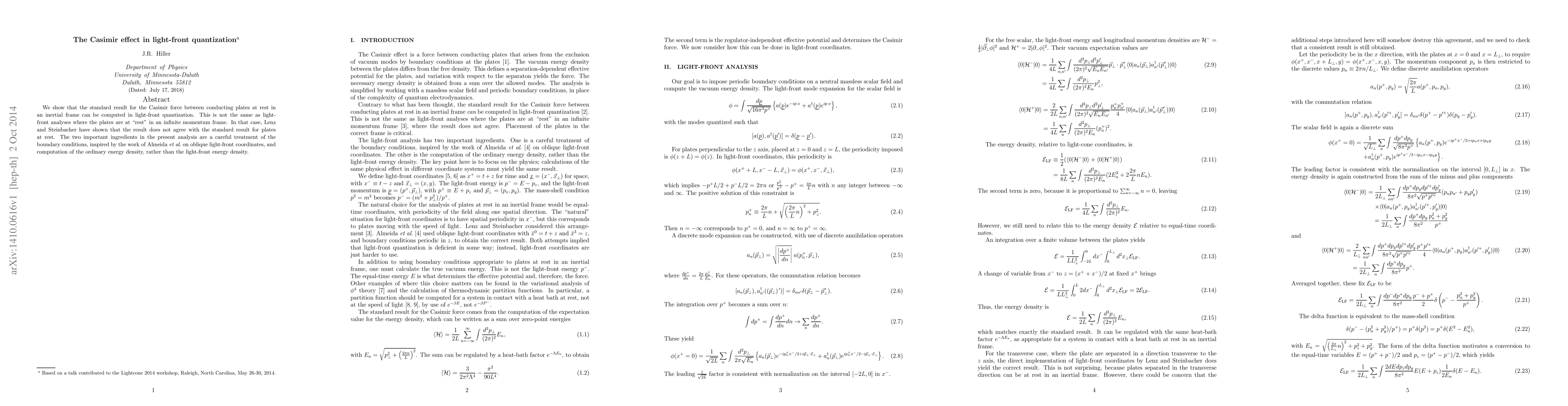 The paper demonstrates that the Casimir force between conducting plates at rest in an inertial frame can be accurately computed using light-front quantization, contrasting with previous results where the plates were analyzed in an infinite momentum frame. Key to this analysis are precise boundary conditions and the computation of ordinary energy density.