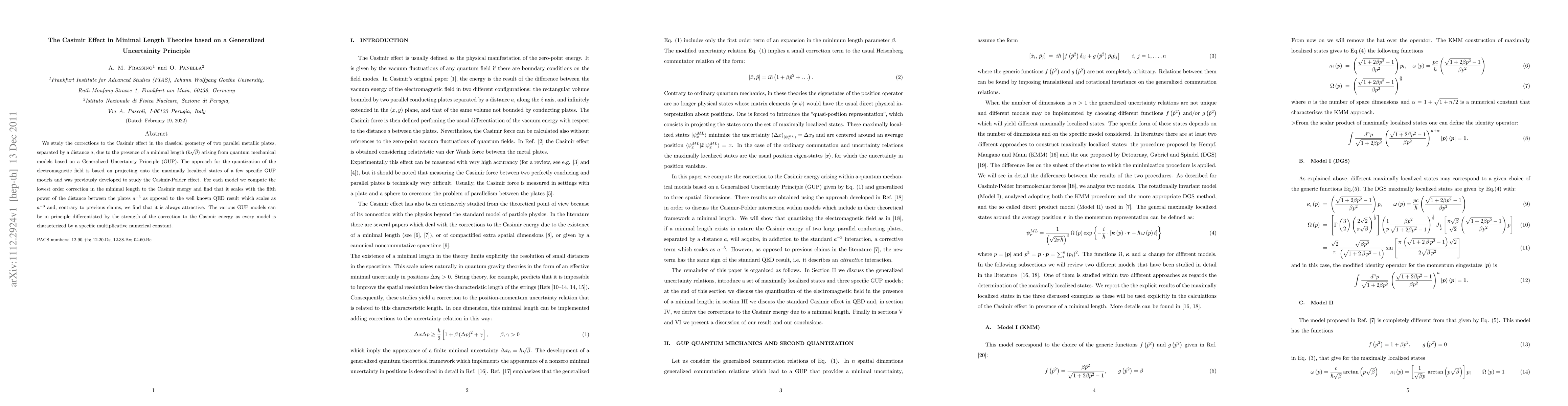 This paper investigates the Casimir effect's modifications due to a minimal length from Generalized Uncertainty Principle models, finding a $a^{-5}$ scaling instead of the usual $a^{-3}$ and confirming an attractive force, with each model's unique numerical constant distinguishing it.