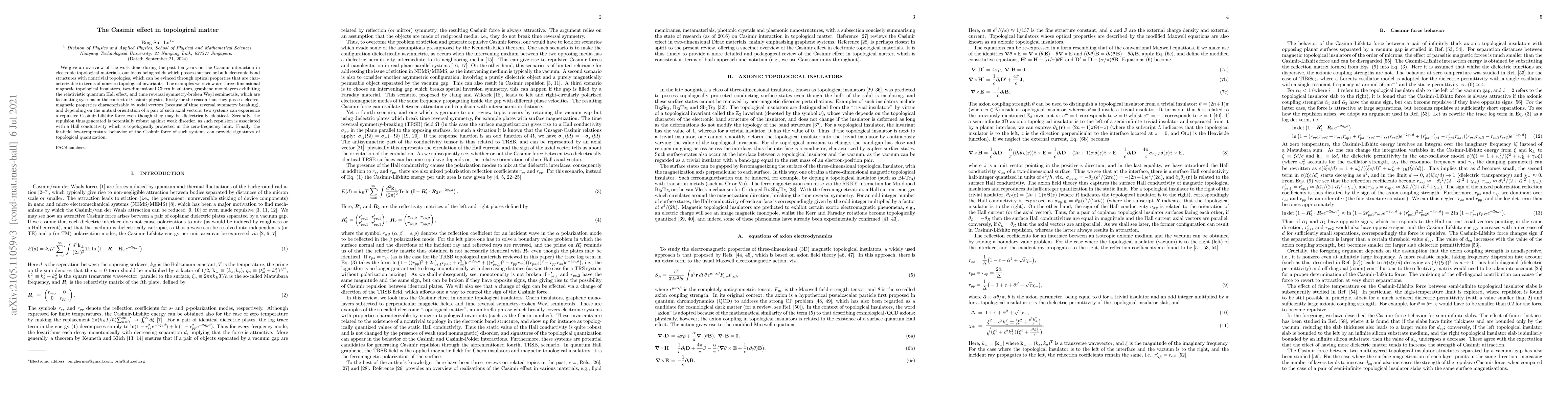 We give an overview of the work done during the past ten years on the Casimir interaction in electronic topological materials, our focus being solids which possess surface or bulk electronic band structures with nontrivial topologies, which can be evinced through optical properties that are characterizable in terms of nonzero topological invariants. The examples we review are three-dimensional magnetic topological insulators, two-dimensional Chern insulators, graphene monolayers exhibiting the relativistic quantum Hall effect, and time reversal symmetry-broken Weyl semimetals, which are fascinating systems in the context of Casimir physics, firstly for the reason that they possess electromagnetic properties characterizable by axial vectors (because of time reversal symmetry breaking), and depending on the mutual orientation of a pair of such axial vectors, two systems can experience a repulsive Casimir-Lifshitz force even though they may be dielectrically identical. Secondly, the repulsion thus generated is potentially robust against weak disorder, as such repulsion is associated with a Hall conductivity which is topologically protected in the zero-frequency limit. Finally, the far-field low-temperature behavior of the Casimir force of such systems can provide signatures of topological quantization.