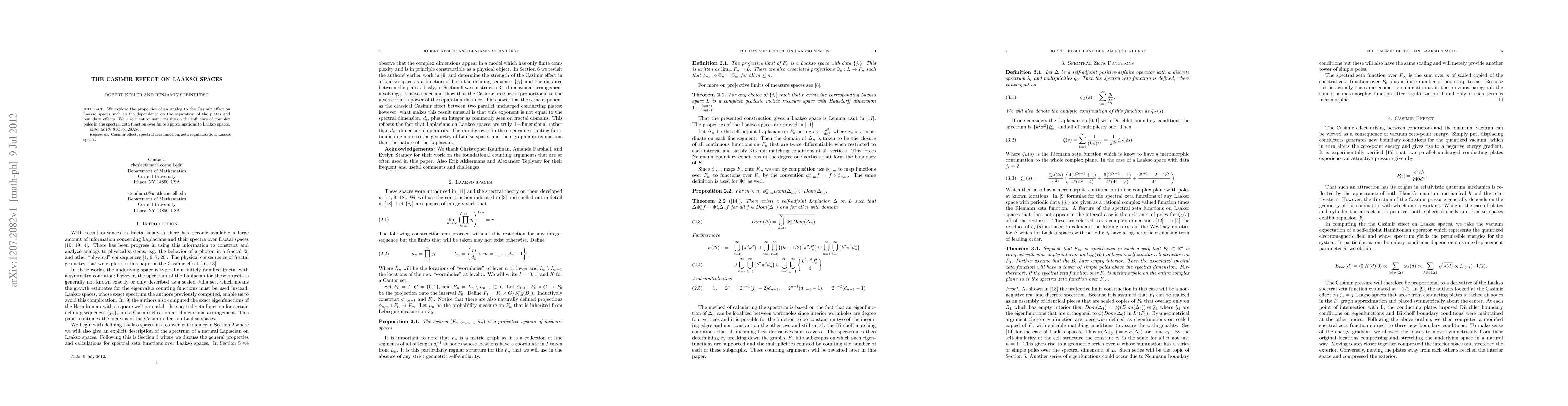 This research investigates the Casimir effect analog in Laakso spaces, focusing on its dependence on plate separation and boundary effects, while also discussing the impact of complex poles in the spectral zeta function on finite approximations of these spaces.