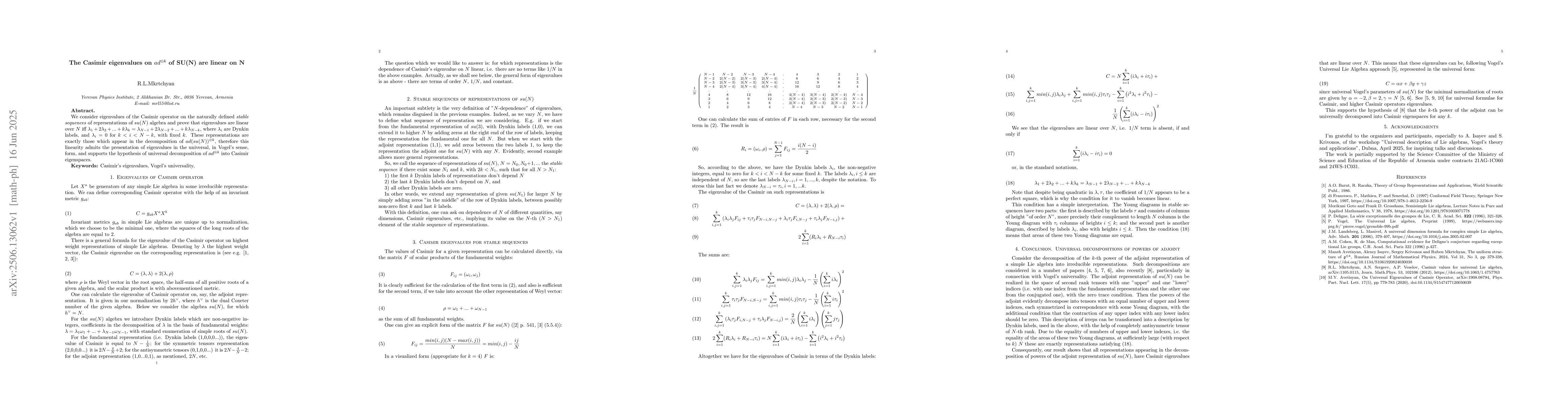 We consider eigenvalues of the Casimir operator on the naturally defined \textit{stable sequences} of representations of $su(N)$ algebra and prove that eigenvalues are linear over $N$ iff $\lambda_1+2\lambda_2+...+k\lambda_k=\lambda_{N-1}+2\lambda_{N-2}+...+k\lambda_{N-k}$, where $\lambda_i$ are Dynkin labels, and $\lambda_i=0$ for $k