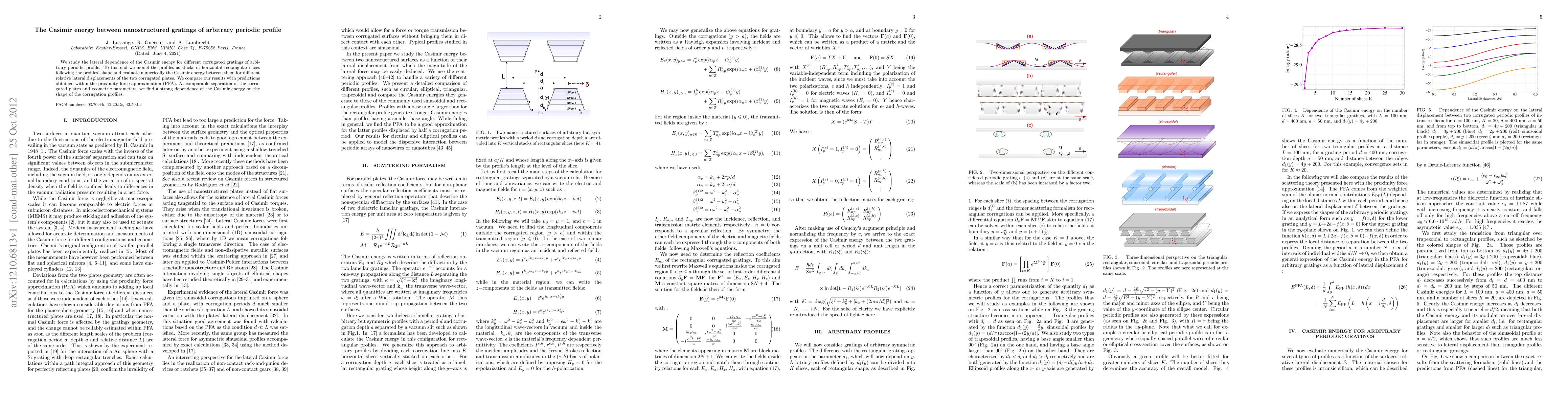 We study the lateral dependence of the Casimir energy for different corrugated gratings of arbitrary periodic profile. To this end we model the profiles as stacks of horizontal rectangular slices following the profiles' shape and evaluate numerically the Casimir energy between them for different relative lateral displacements of the two corrugated plates. We compare our results with predictions obtained within the proximity force approximation (PFA). At comparable separation of the corrugated plates and geometric parameters, we find a strong dependence of the Casimir energy on the shape of the corrugation profiles.