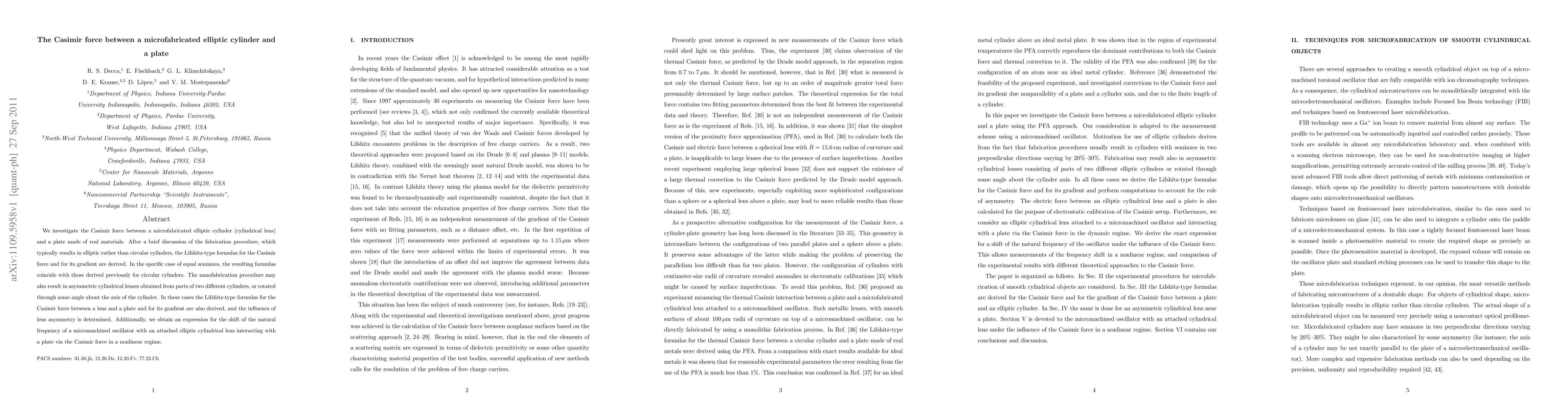 This research investigates the Casimir force between microfabricated elliptic cylinders and plates, deriving Lifshitz-type formulas for force and gradient. It explores variations in cylinder shape and asymmetry, and provides an expression for frequency shift in micromachined oscillators under Casimir interaction.