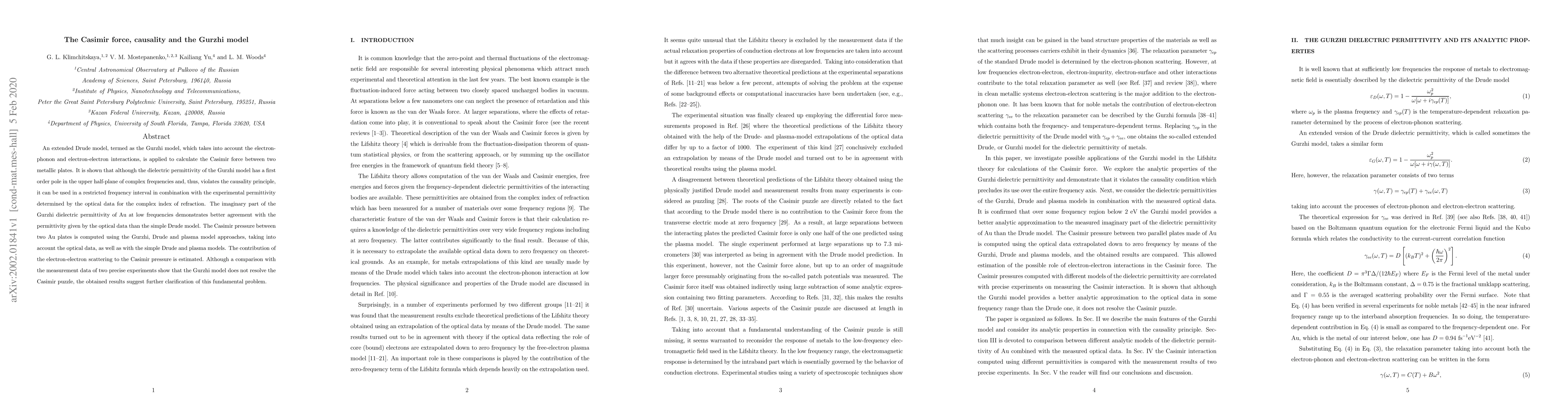 This paper applies the Gurzhi model, an extended Drude model considering electron-phonon and electron-electron interactions, to calculate the Casimir force between metallic plates. Despite violating causality, the model provides better low-frequency agreement with optical data compared to the simple Drude model, though it does not resolve the Casimir puzzle.