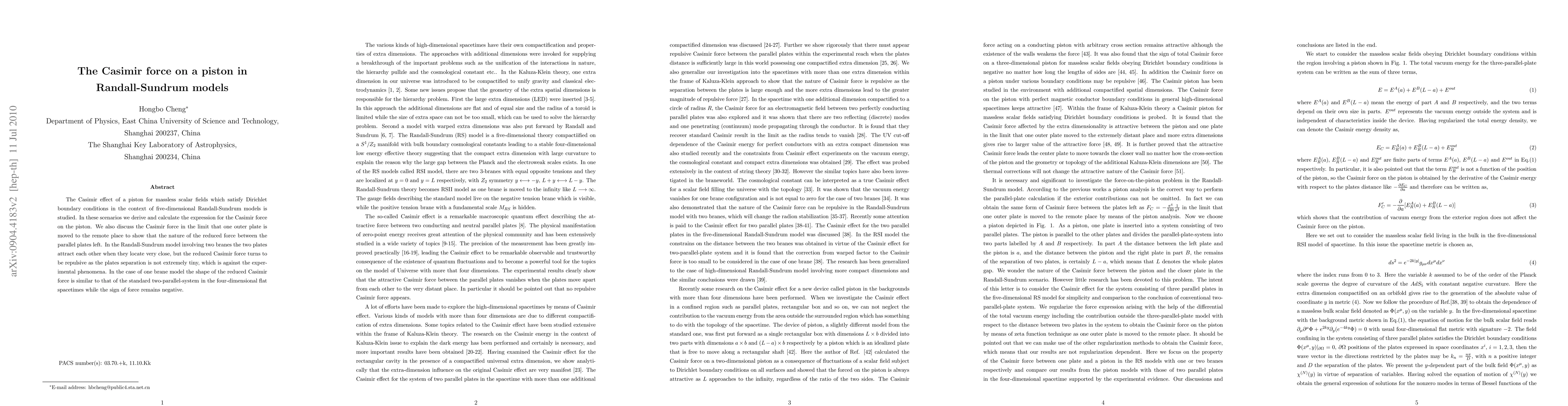 This paper investigates the Casimir force on a piston in five-dimensional Randall-Sundrum models, deriving expressions for the force and analyzing its behavior under varying plate separations. It finds that in two-brane models, the Casimir force becomes repulsive at moderate separations contrary to experimental observations, while in one-brane models, it behaves similarly to the standard four-dimensional case.