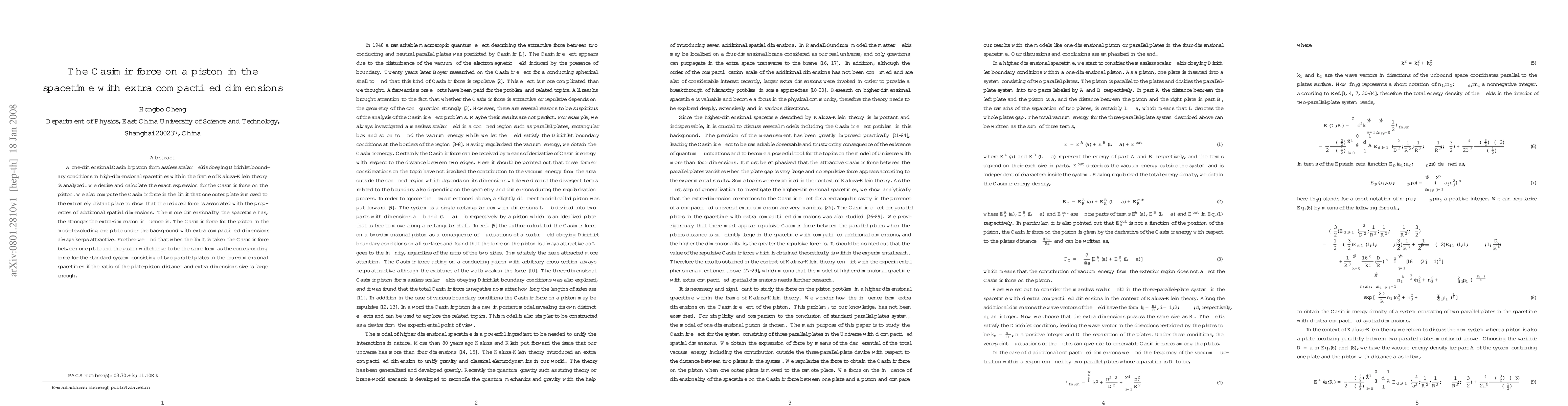 This research analyzes the Casimir force on a piston in high-dimensional spacetimes using Kaluza-Klein theory, deriving expressions that show the influence of extra dimensions on the force, which is stronger with increased dimensionality and remains attractive even without a second plate. In the limit where one plate is moved far away, the Casimir force converges to a form similar to that in four-dimensional spacetimes when the plate-piston distance is large relative to extra dimensions.