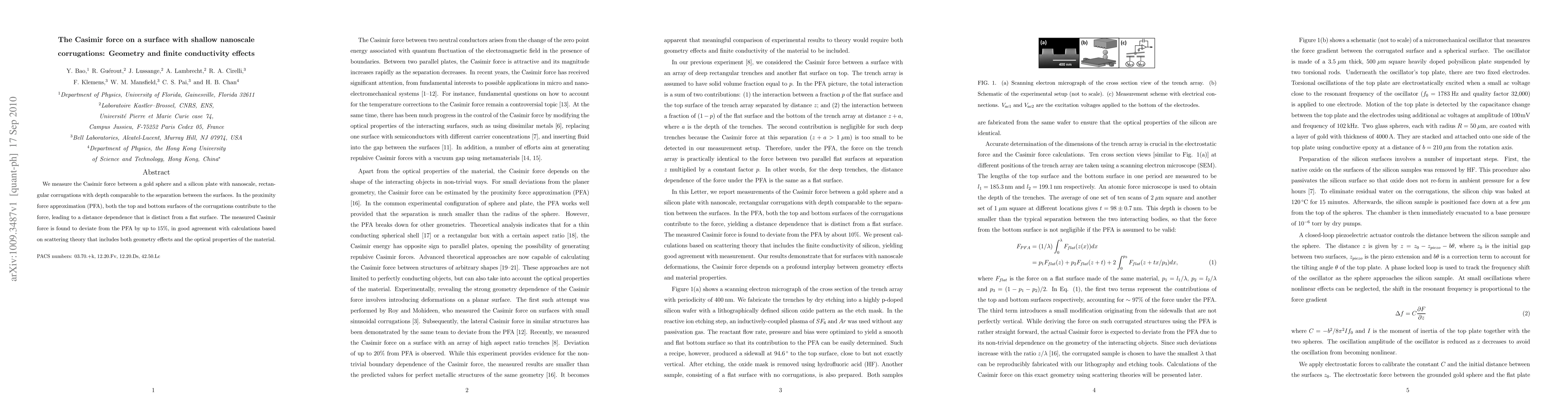 This study measures the Casimir force between a gold sphere and a silicon plate with nanoscale corrugations, finding deviations from the proximity force approximation. The results align with scattering theory calculations that consider both geometric and material conductivity effects.