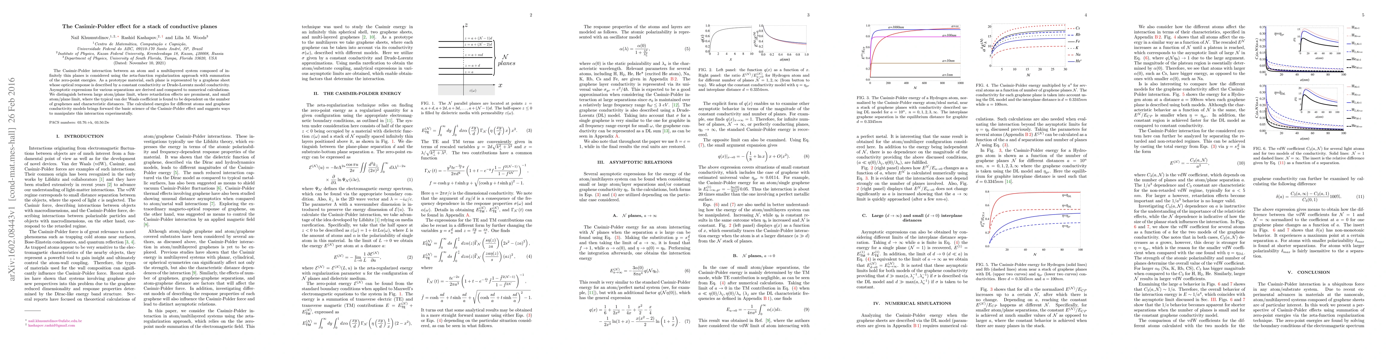 The Casimir-Polder interaction between an atom and a multilayered system composed of infinitely thin planes is considered using the zeta-function regularization approach with summation of the zero-point energies. As a prototype material, each plane is represented by a graphene sheet whose optical response is described by a constant conductivity or Drude-Lorentz model conductivity. Asymptotic expressions for various separations are derived and compared to numerical calculations. We distinguish between large atom/plane limit, where retardation effects are prominent, and small atom/plane limit, where the typical van der Waals coefficient is found to be dependent on the number of graphenes and characteristic distances. The calculated energies for different atoms and graphene conductivity models brings forward the basic science of the Casimir-Polder effect and suggests ways to manipulate this interaction experimentally.