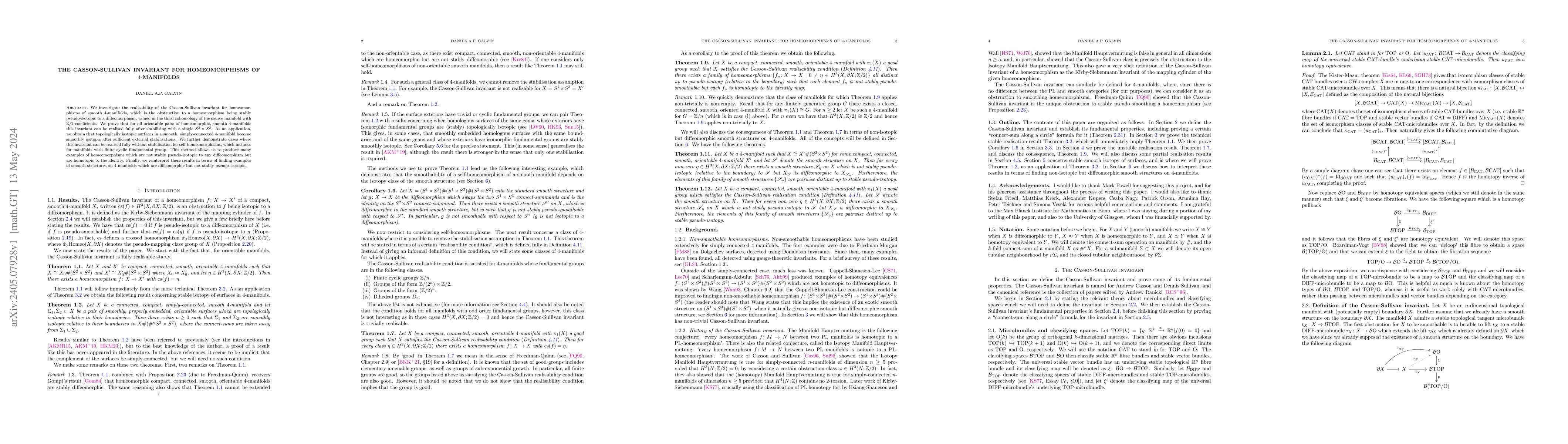 This paper explores the Casson-Sullivan invariant for homeomorphisms of smooth 4-manifolds, proving its full realisability after stabilisation with a single $S^2\times S^2$. It also provides examples of homeomorphisms that are not stably pseudo-isotopic to any diffeomorphism but are homotopic to the identity, illustrating distinctions between topological and smooth isotopy in 4-manifolds.