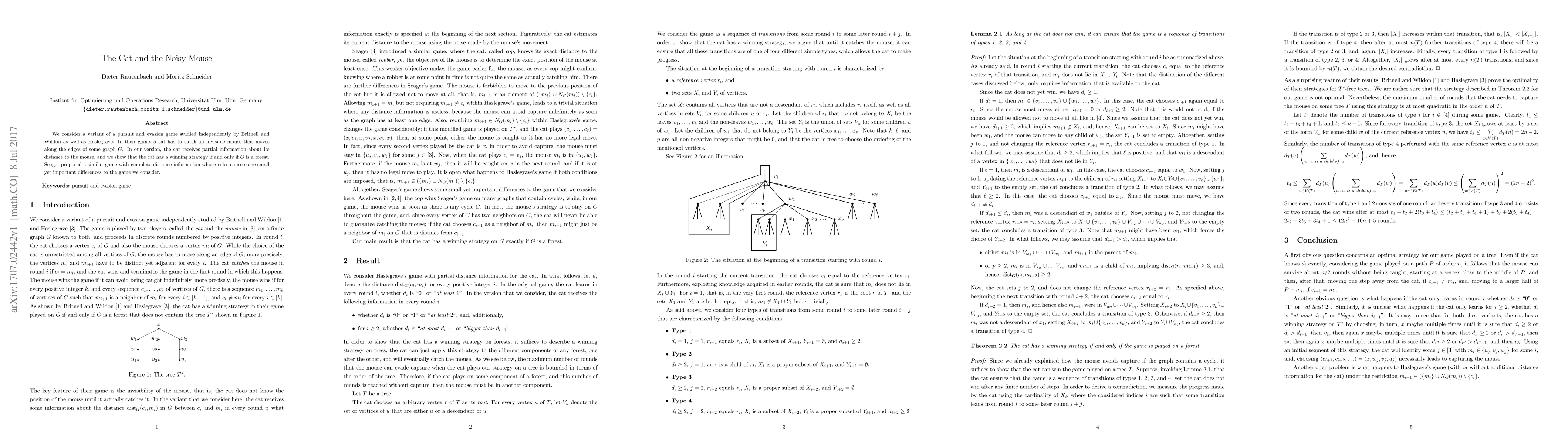 This paper explores a variant of a pursuit game where a cat tries to catch an invisible mouse moving on a graph's edges. The cat gets partial distance info, and the study reveals the cat wins if and only if the graph is a forest. The research distinguishes this from a similar game with complete distance info proposed by Seager.