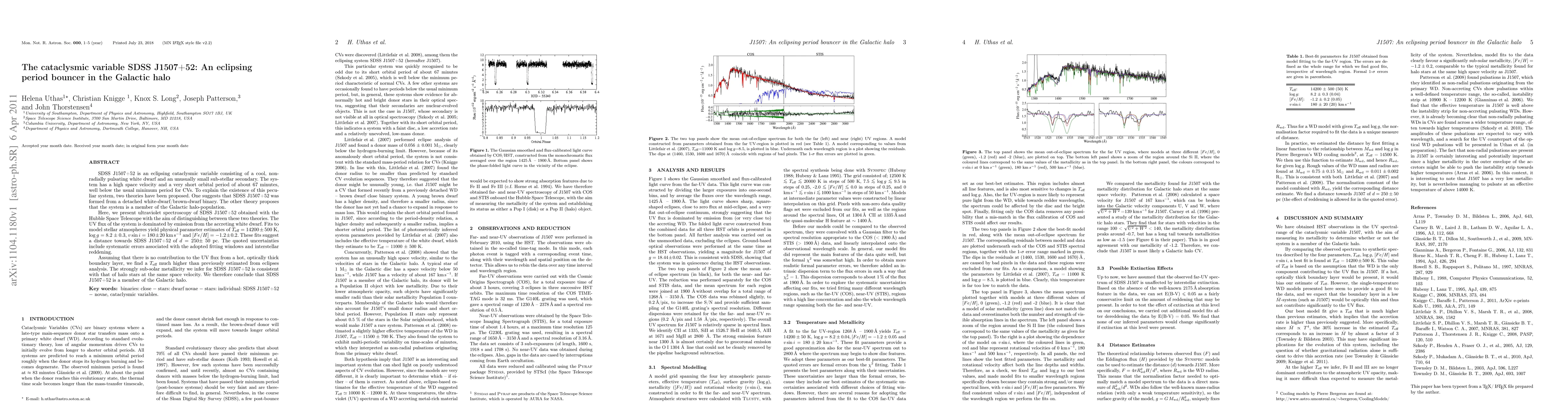 SDSS J1507+52 is an eclipsing cataclysmic variable consisting of a cool, non-radially pulsating white dwarf and an unusually small sub-stellar secondary. The system has a high space velocity and a very short orbital period of about 67 minutes, well below the usual minimum period for CVs. To explain the existence of this peculiar system, two theories have been proposed. One suggests that SDSS J1507+52 was formed from a detached white-dwarf/brown-dwarf binary. The other theory proposes that the system is a member of the Galactic halo-population. Here, we present ultraviolet spectroscopy of SDSS J1507+52 obtained with the Hubble Space Telescope with the aim of distinguishing between these two theories. The UV flux of the system is dominated by emission from the accreting white dwarf. Fits to model stellar atmospheres yield physical parameter estimates of T(eff) = 14200 \pm 500 K, log(g)=8.2 \pm 0.3, vsin(i)=180 \pm 20 kms-1 and [Fe/H]=-1.2 \pm 0.2. These fits suggest a distance towards SDSS J1507+52 of d = 250 \pm 50 pc. The quoted uncertainties include systematic errors associated with the adopted fitting windows and interstellar reddening. Assuming that there is no contribution to the UV flux from a hot, optically thick boundary layer, we find a T(eff) much higher than previously estimated from eclipse analysis. The strongly sub-solar metallicity we infer for SDSS J1507+52 is consistent with that of halo stars at the same space velocity. We therefore conclude that SDSS J1507+52 is a member of the Galactic halo.