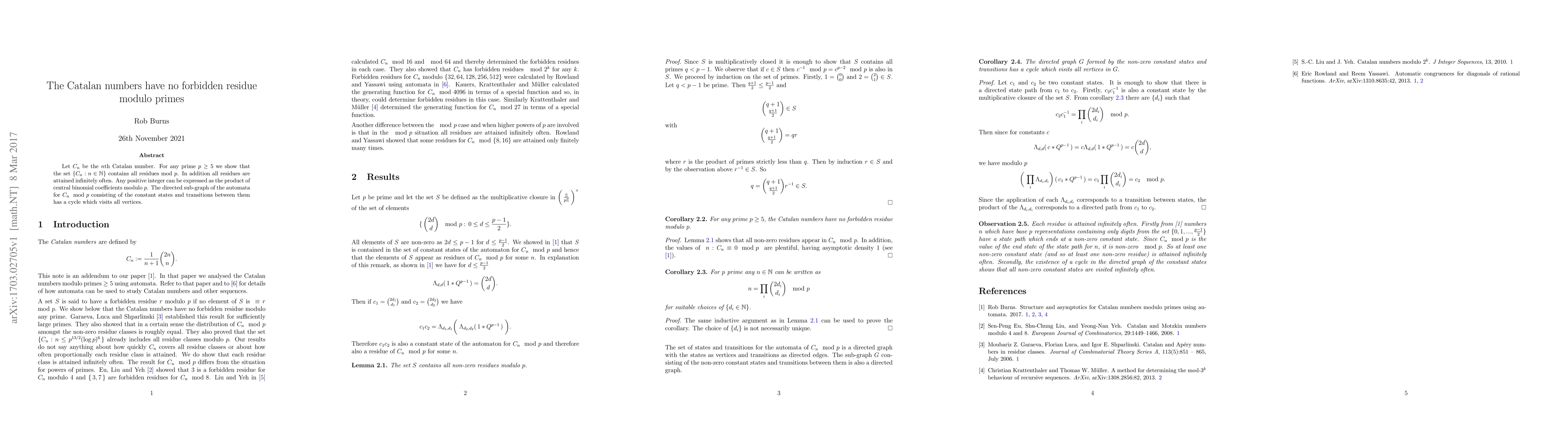 Let $C_n$ be the $n$th Catalan number. For any prime $p \geq 5$ we show that the set $\{C_n : n \in \mathbb{N} \}$ contains all residues mod $p$. In addition all residues are attained infinitely often. Any positive integer can be expressed as the product of central binomial coefficients modulo $p$. The directed sub-graph of the automata for $C_n \mod p$ consisting of the constant states and transitions between them has a cycle which visits all vertices.