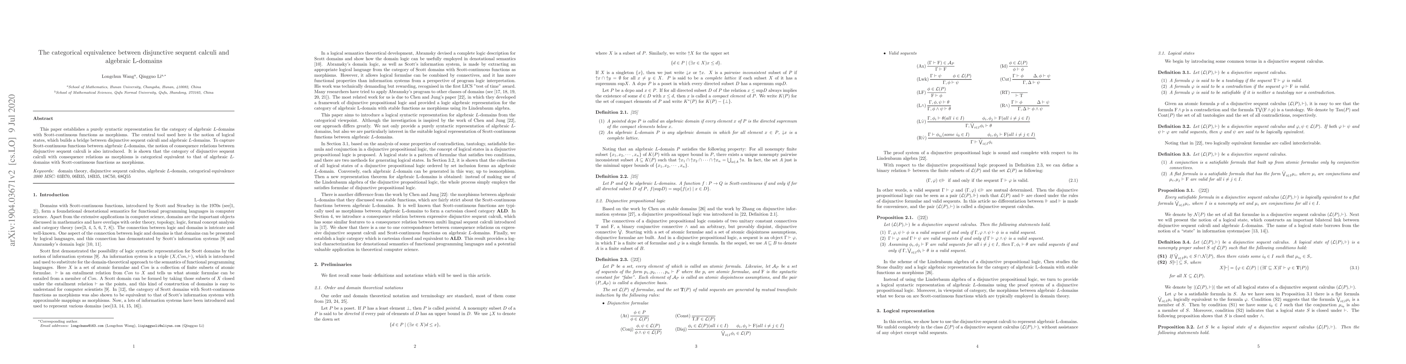 This paper presents a syntactic representation of algebraic L-domains using disjunctive sequent calculi and demonstrates their categorical equivalence via logical states and consequence relations. The equivalence highlights the relationship between Scott-continuous functions and consequence relations between calculi.