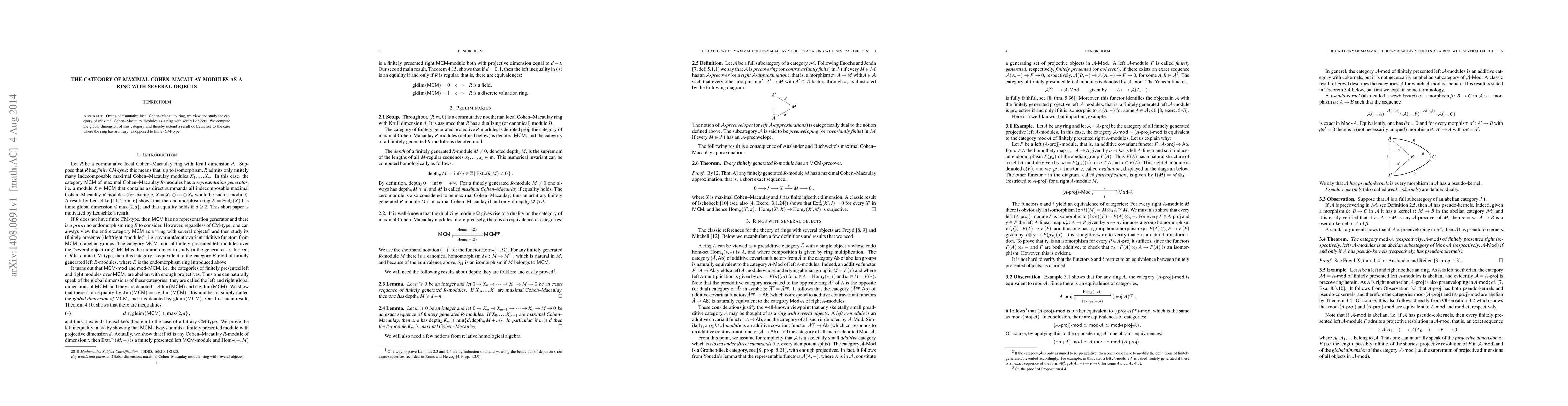 Over a commutative local Cohen--Macaulay ring, we view and study the category of maximal Cohen--Macaulay modules as a ring with several objects. We compute the global dimension of this category and thereby extend a result of Leuschke to the case where the ring has arbitrary (as opposed to finite) CM-type.