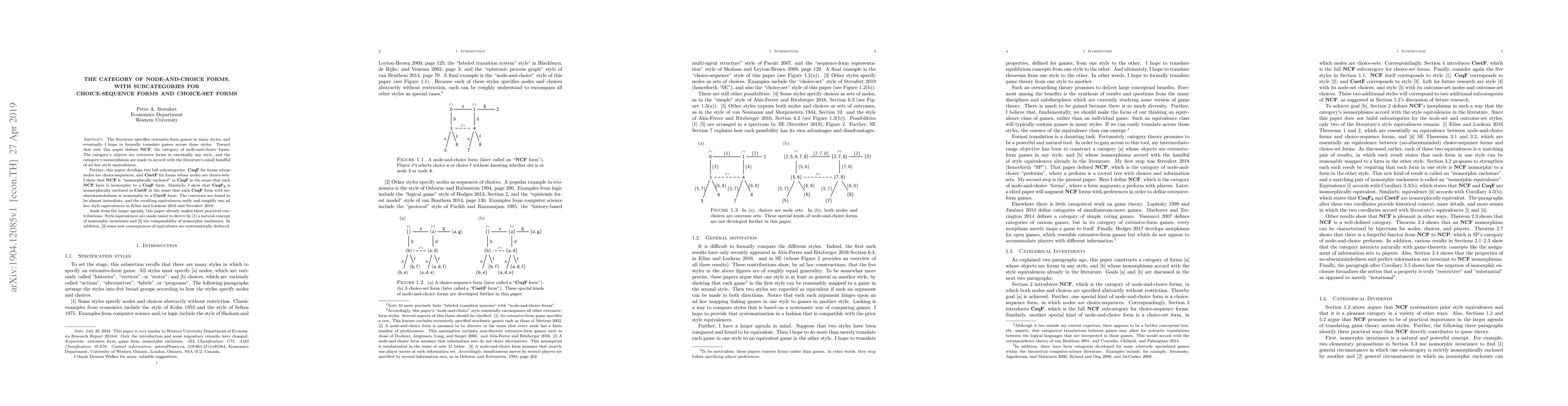 The literature specifies extensive-form games in many styles, and eventually I hope to formally translate games across those styles. Toward that end, this paper defines $\mathbf{NCF}$, the category of node-and-choice forms. The category's objects are extensive forms in essentially any style, and the category's isomorphisms are made to accord with the literature's small handful of ad hoc style equivalences. Further, this paper develops two full subcategories: $\mathbf{CsqF}$ for forms whose nodes are choice-sequences, and $\mathbf{CsetF}$ for forms whose nodes are choice-sets. I show that $\mathbf{NCF}$ is "isomorphically enclosed" in $\mathbf{CsqF}$ in the sense that each $\mathbf{NCF}$ form is isomorphic to a $\mathbf{CsqF}$ form. Similarly, I show that $\mathbf{CsqF_{\tilde a}}$ is isomorphically enclosed in $\mathbf{CsetF}$ in the sense that each $\mathbf{CsqF}$ form with no-absentmindedness is isomorphic to a $\mathbf{CsetF}$ form. The converses are found to be almost immediate, and the resulting equivalences unify and simplify two ad hoc style equivalences in Kline and Luckraz 2016 and Streufert 2019. Aside from the larger agenda, this paper already makes three practical contributions. Style equivalences are made easier to derive by [1] a natural concept of isomorphic invariance and [2] the composability of isomorphic enclosures. In addition, [3] some new consequences of equivalence are systematically deduced.