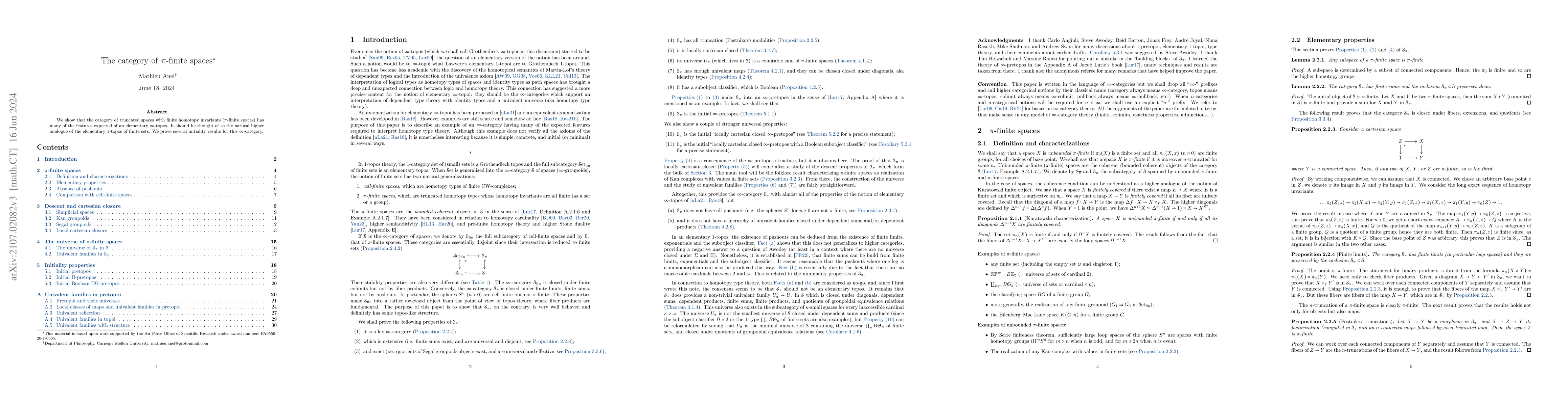 This paper establishes that the category of $\pi$-finite spaces exhibits characteristics of an elementary $\infty$-topos, analogous to the 1-topos of finite sets, and proves several initiality results. An appendix discusses univalent families within $\infty$-pretopoi.