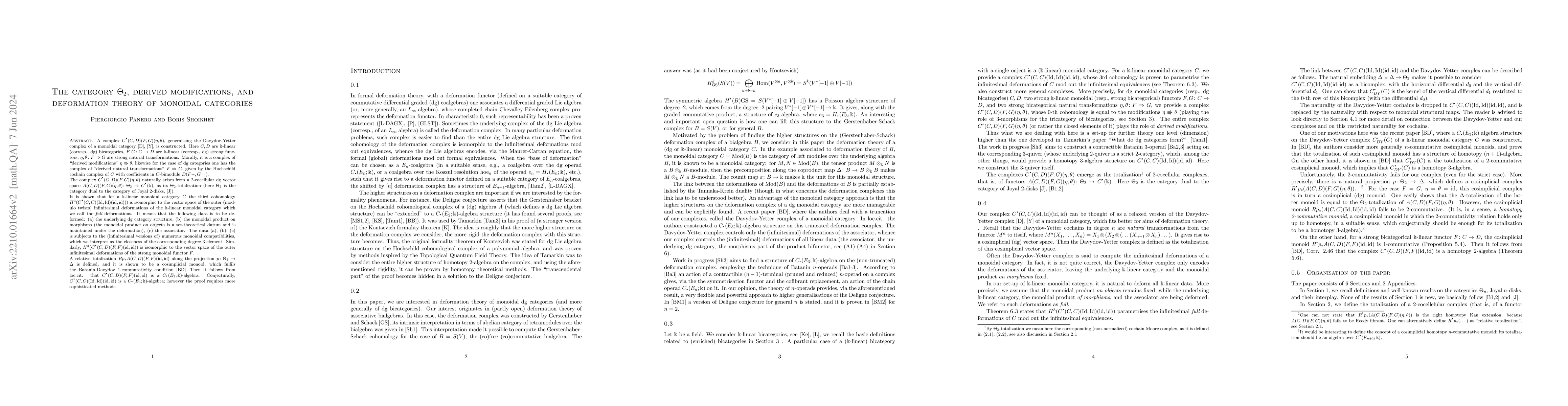 A complex $C^\bullet(C,D)(F,G)(\eta, \theta)$, generalising the Davydov-Yetter complex of a monoidal category, is constructed. Here $C,D$ are $\Bbbk$-linear (dg) monoidal categories, $F,G\colon C\to D$ are $\Bbbk$-linear (dg) strict monoidal functors, $\eta,\theta\colon F\Rightarrow G$ are monoidal natural transformations. Morally, it is a complex of ``derived modifications'' $\eta \Rrightarrow \theta$, likewise for the case of dg categories one has the complex of ``derived natural transformations'' $F\Rightarrow G$, given by the Hochschild cochain complex of $C$ with coefficients in $C$-bimodule $D(F-,G=)$. As well, an intrinsic homological algebra interpretation of $C^\bullet(C,D)(F,G)(\eta,\theta)$ as $RHom$ in an abelian category of 2-bimodules over $C$, is provided. The complex $C^\bullet(C,D)(F,G)(\eta,\theta)$ naturally arises from a 2-cocellular dg vector space $A(C,D)(F,G)(\eta,\theta)\colon \Theta_2\to C^\bullet(\Bbbk)$, as its $\Theta_2$-totalization (here $\Theta_2$ is the category dual to the category of Joyal 2-disks). It is shown that $H^3(C^\bullet(C,C)(\mathrm{Id},\mathrm{Id})(\mathrm{id},\mathrm{id})))$ is isomorphic to the vector space of the outer infinitesimal deformations of the $\Bbbk$-linear monoidal category which we call {\it full} deformations. It means that the following data is to be deformed: (a) the underlying dg category structure, (b) the monoidal product on morphisms (the monoidal product on objects is a set-theoretical datum and is maintained under the deformation), (c) the associator. It is shown that $C^\bullet(C,D)(F,F)(\mathrm{id},\mathrm{id})$ is a homotopy $e_2$-algebra. Conjecturally, $C^\bullet(C,C)(\mathrm{Id},\mathrm{Id})(\mathrm{id},\mathrm{id})$ is a homotopy $e_3$-algebra; however the proof requires more sophisticated methods and we hope to complete it in our next paper.