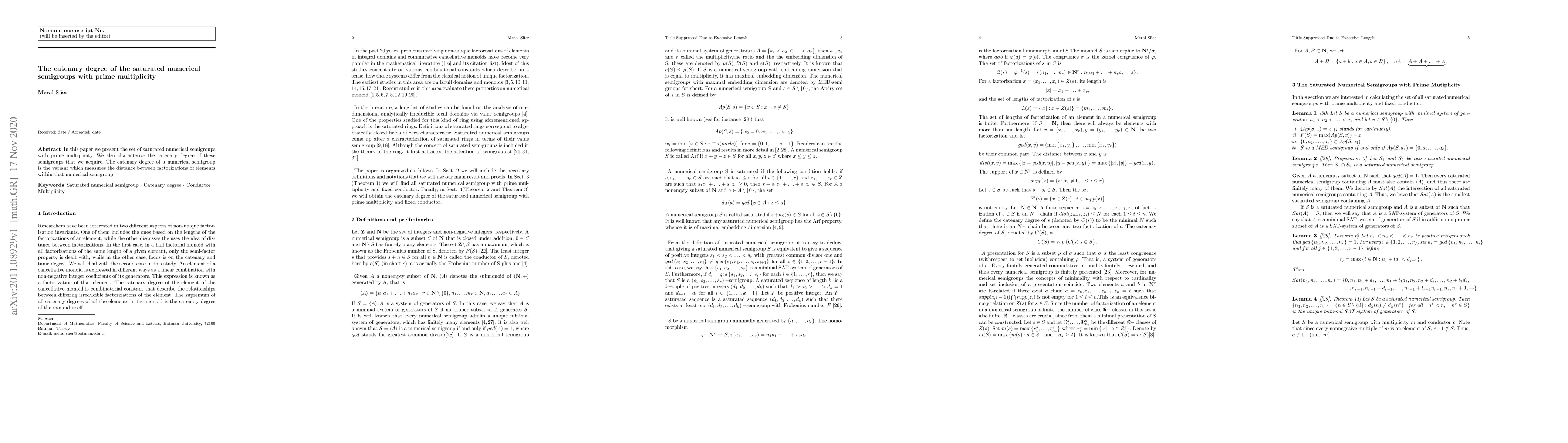 In this paper we present the set of saturated numerical semigroups with prime multiplicity. We also characterize the catenary degree of these semigroups that we acquire. The catenary degree of a numerical semigroup is the variant which measures the distance between factorizations of elements within that numerical semigroup.