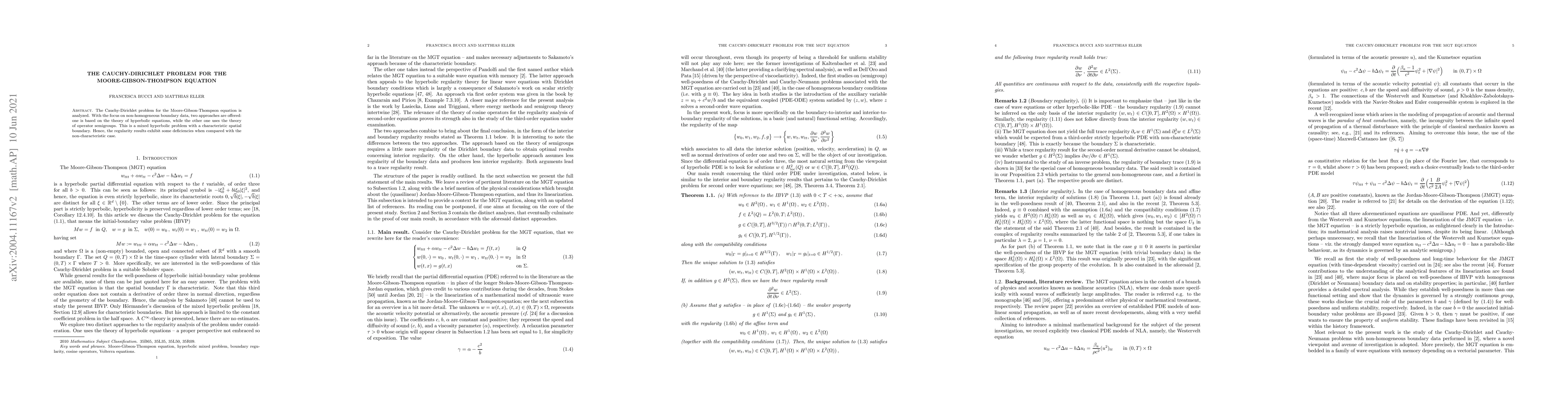 Summary: This paper analyzes the Cauchy-Dirichlet problem for the Moore-Gibson-Thompson equation, employing hyperbolic equation theory and operator semigroups for non-homogeneous boundary data, revealing regularity deficiencies compared to non-characteristic cases.