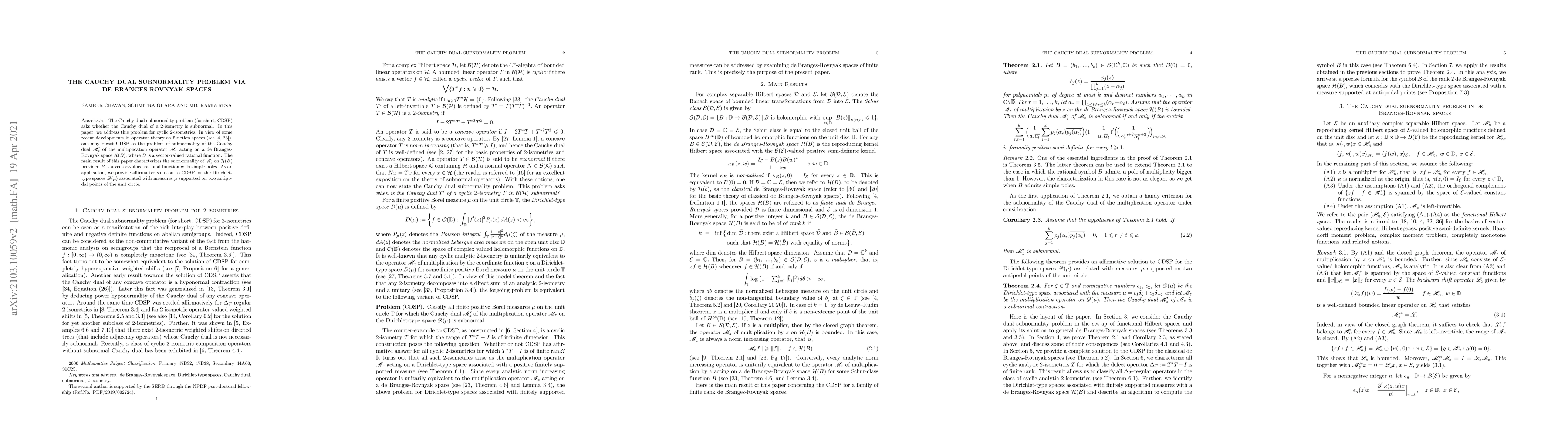 The Cauchy dual subnormality problem (for short, CDSP) asks whether the Cauchy dual of a $2$-isometry is subnormal. In this paper, we address this problem for cyclic $2$-isometries. In view of some recent developments in operator theory on function spaces (see \cite{AM, LGR}), one may recast CDSP as the problem of subnormality of the Cauchy dual $\mathscr M'_z$ of the multiplication operator $\mathscr M_z$ acting on a de Branges-Rovnyak space $\mathcal H(B),$ where $B$ is a vector-valued rational function. The main result of this paper characterizes the subnormality of $\mathscr M'_z$ on $\mathcal H(B)$ provided $B$ is a vector-valued rational function with simple poles. As an application, we provide affirmative solution to CDSP for the Dirichlet-type spaces $\mathscr D(\mu)$ associated with measures $\mu$ supported on two antipodal points of the unit circle.