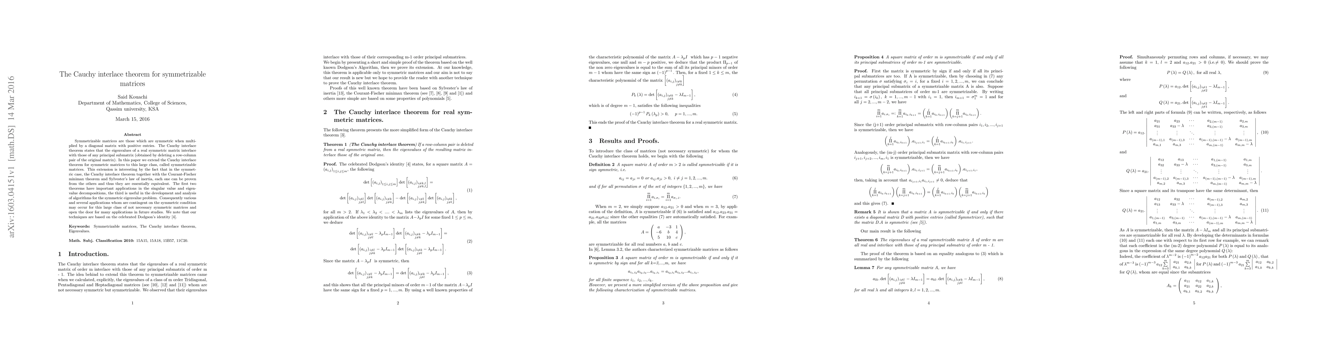 This paper extends the Cauchy interlace theorem from symmetric to symmetrizable matrices, leveraging Dodgson's identity. This extension opens up potential applications in eigenvalue and singular value decompositions and algorithm development for non-symmetric matrices.