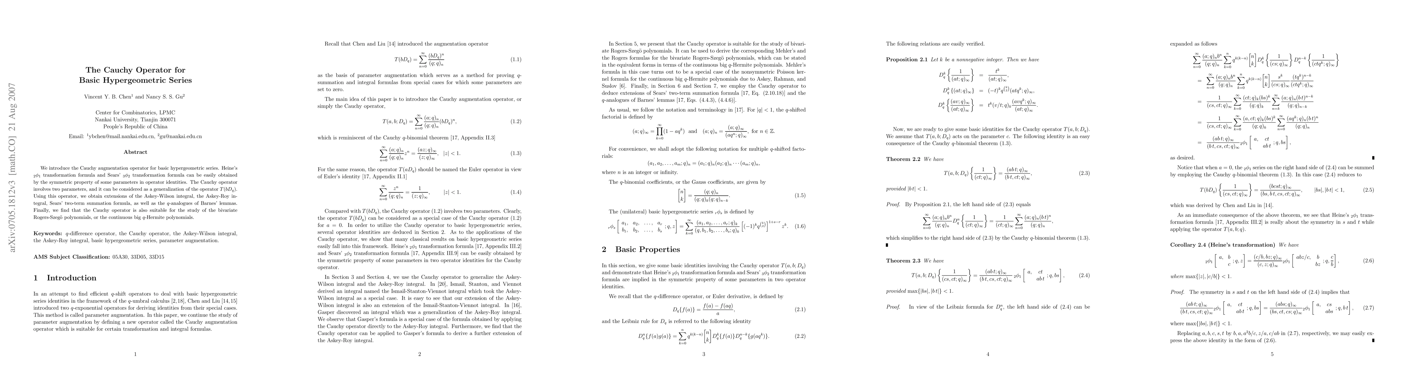 We introduce the Cauchy augmentation operator for basic hypergeometric series. Heine's ${}_2\phi_1$ transformation formula and Sears' ${}_3\phi_2$ transformation formula can be easily obtained by the symmetric property of some parameters in operator identities. The Cauchy operator involves two parameters, and it can be considered as a generalization of the operator $T(bD_q)$. Using this operator, we obtain extensions of the Askey-Wilson integral, the Askey-Roy integral, Sears' two-term summation formula, as well as the $q$-analogues of Barnes' lemmas. Finally, we find that the Cauchy operator is also suitable for the study of the bivariate Rogers-Szeg\"o polynomials, or the continuous big $q$-Hermite polynomials.