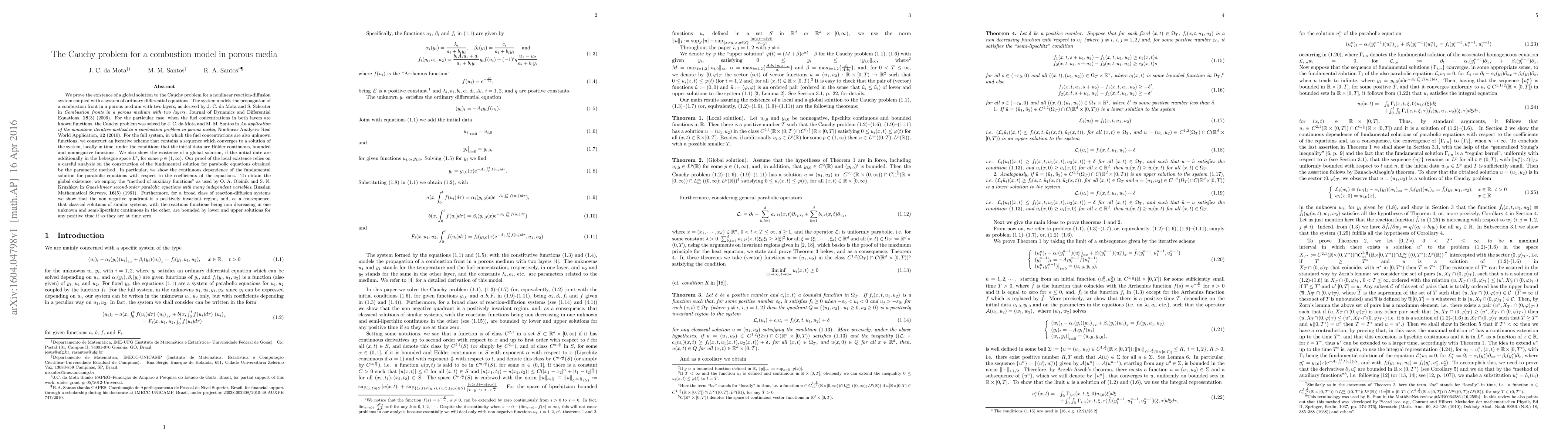 We prove the existence of a global solution to the Cauchy problem for a nonlinear reaction-diffusion system coupled with a system of ordinary differential equations. The system models the propagation of a combustion front in a porous medium with two layers, as derived by J. C. da Mota and S. Schecter in Combustion fronts in a porous medium with two layers, Journal of Dynamics and Differential Equations, 18(3) (2006). For the particular case, when the fuel concentrations in both layers are known functions, the Cauchy problem was solved by J. C. da Mota and M. M. Santos in An application of the monotone iterative method to a combustion problem in porous media, Nonlinear Analysis: Real World Application, 12 (2010). For the full system, in which the fuel concentrations are also unknown functions, we construct an iterative scheme that contains a sequence which converges to a solution of the system, locally in time, under the conditions that the initial data are Holder continuous, bounded and nonnegative functions. We also show the existence of a global solution, if the initial date are additionally in the Lebesgue space $L^p$, for some $p\in(1,\infty)$. Furthermore, for a broad class of reaction-diffusion systems we show that the non negative quadrant is a positively invariant region, and, as a consequence, that classical solutions of similar systems, with the reactions functions being non decreasing in one unknown and semi-lipscthitz continuous in the other, are bounded by lower and upper solutions for any positive time if so they are at time zero.