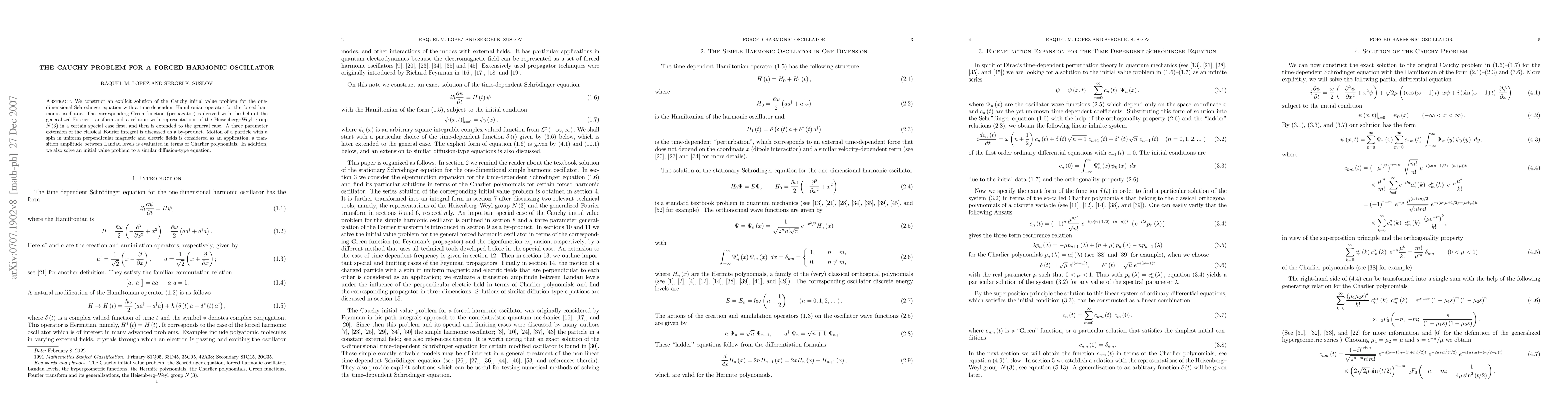 We construct an explicit solution of the Cauchy initial value problem for the one-dimensional Schroedinger equation with a time-dependent Hamiltonian operator for the forced harmonic oscillator. The corresponding Green function (propagator) is derived with the help of the generalized Fourier transform and a relation with representations of the Heisenberg-Weyl group N(3) in a certain special case first, and then is extended to the general case. A three parameter extension of the classical Fourier integral is discussed as a by-product. Motion of a particle with a spin in uniform perpendicular magnetic and electric fields is considered as an application; a transition amplitude between Landau levels is evaluated in terms of Charlier polynomials. In addition, we also solve an initial value problem to a similar diffusion-type equation.
