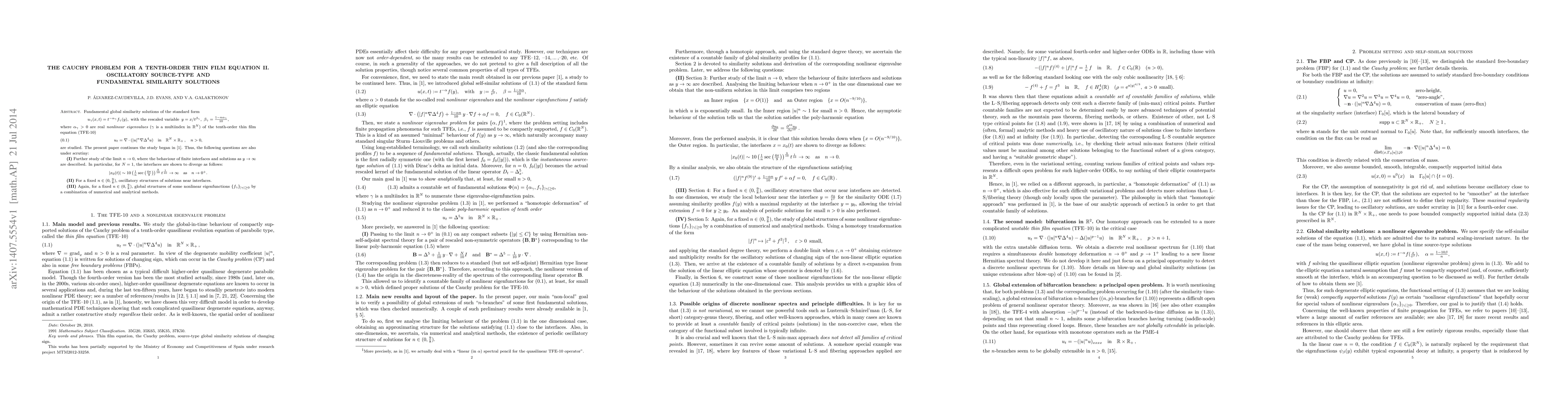 Researchers studied fundamental global similarity solutions of a tenth-order thin film equation, finding oscillatory source-type solutions and structures near interfaces for certain values of n.