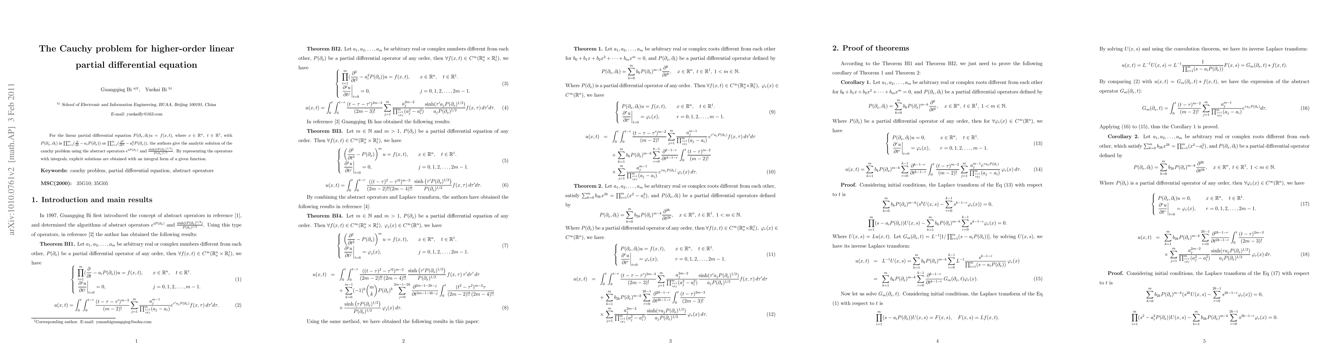 Researchers provide an analytic solution to the Cauchy problem for higher-order linear partial differential equations using abstract operators $e^{tP(rac{ riangle}{ riangle x})}$ and $rac{ ext{sh}(tP(rac{ riangle}{ riangle x}))}{P(rac{ riangle}{ riangle x}}$, representing a key advancement in solving these equations.