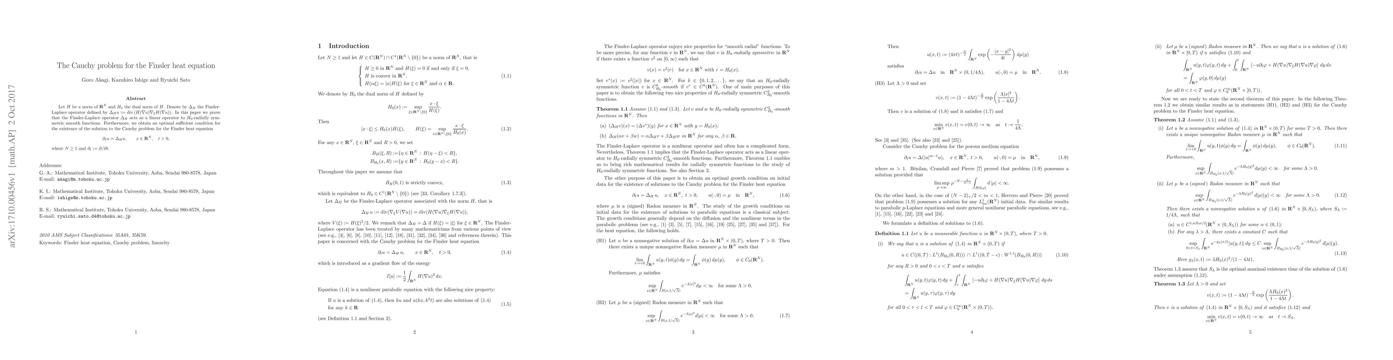 Let $H$ be a norm of ${\bf R}^N$ and $H_0$ the dual norm of $H$. Denote by $\Delta_H$ the Finsler-Laplace operator defined by $\Delta_Hu:=\mbox{div}\,(H(\nabla u)\nabla_\xi H(\nabla u))$. In this paper we prove that the Finsler-Laplace operator $\Delta_H$ acts as a linear operator to $H_0$-radially symmetric smooth functions. Furthermore, we obtain an optimal sufficient condition for the existence of the solution to the Cauchy problem for the Finsler heat equation $$ \partial_t u=\Delta_H u,\qquad x\in{\bf R}^N,\quad t>0, $$ where $N\ge 1$ and $\partial_t:=\partial/\partial t$.