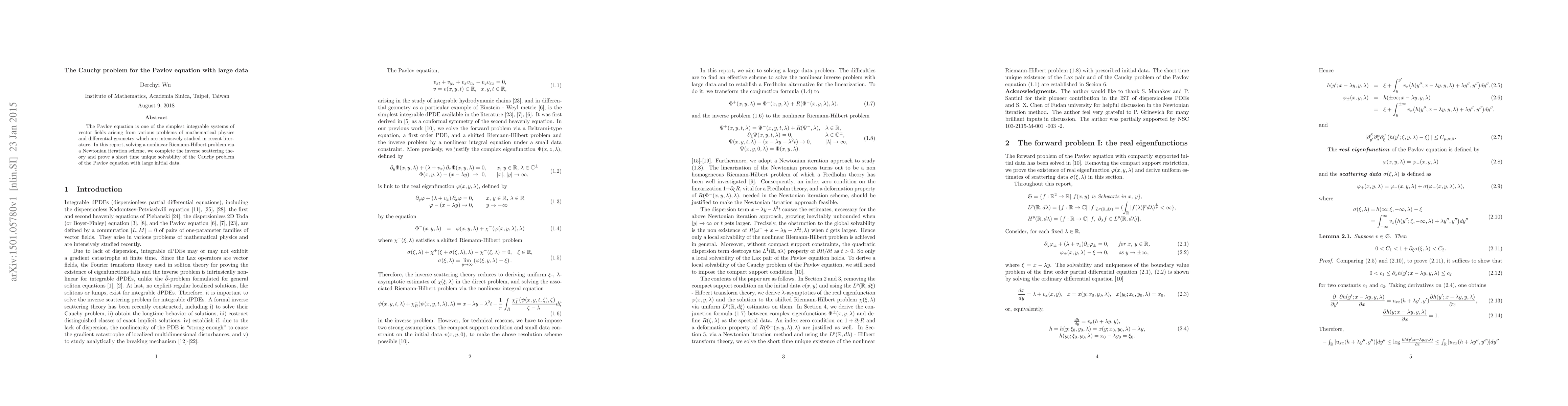 Researchers solved a nonlinear problem in mathematical physics, proving that a complex equation can be uniquely solved with large initial data for a short time. This breakthrough completes an inverse scattering theory for the Pavlov equation.