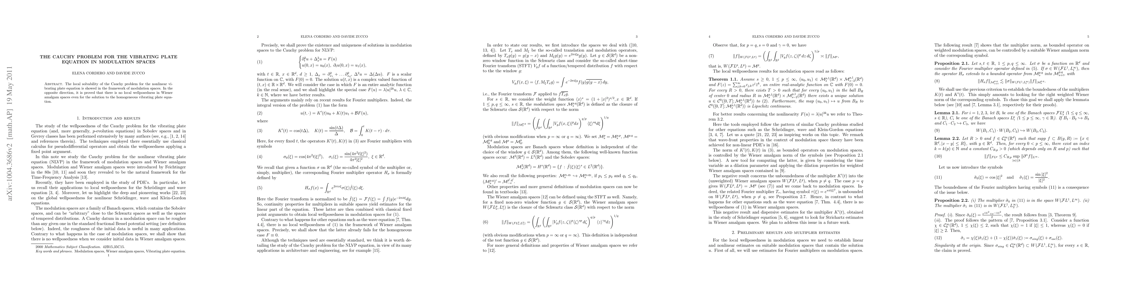 Summary: This paper demonstrates the local solvability of the nonlinear vibrating plate equation using modulation spaces, while proving that no local wellposedness exists in Wiener amalgam spaces, even for the homogeneous equation.