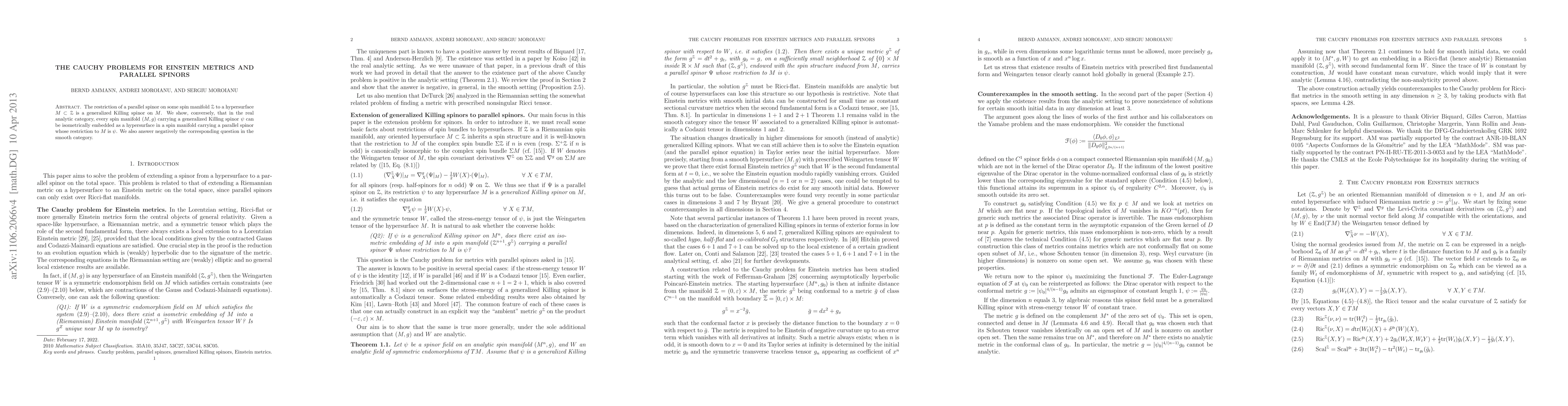 We show that in the analytic category, given a Riemannian metric $g$ on a hypersurface $M\subset \Z$ and a symmetric tensor $W$ on $M$, the metric $g$ can be locally extended to a Riemannian Einstein metric on $Z$ with second fundamental form $W$, provided that $g$ and $W$ satisfy the constraints on $M$ imposed by the contracted Codazzi equations. We use this fact to study the Cauchy problem for metrics with parallel spinors in the real analytic category and give an affirmative answer to a question raised in B\"ar, Gauduchon, Moroianu (2005). We also answer negatively the corresponding questions in the smooth category.