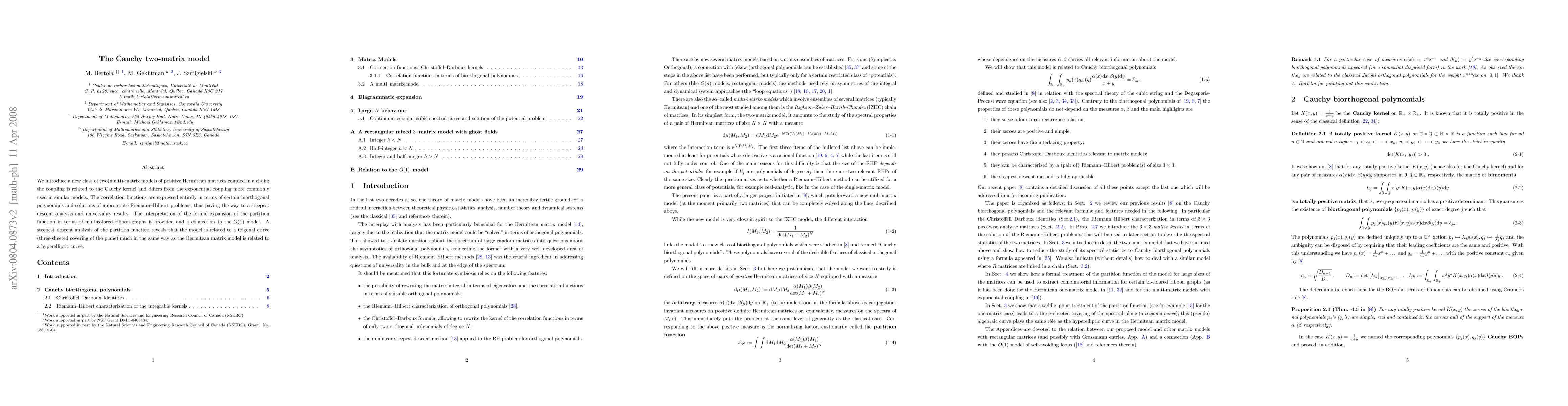This paper introduces a novel two-matrix model of positive Hermitian matrices linked via the Cauchy kernel, with correlation functions expressed through biorthogonal polynomials and Riemann-Hilbert problems. The model's partition function is analyzed via steepest descent methods, revealing a connection to a trigonal curve.