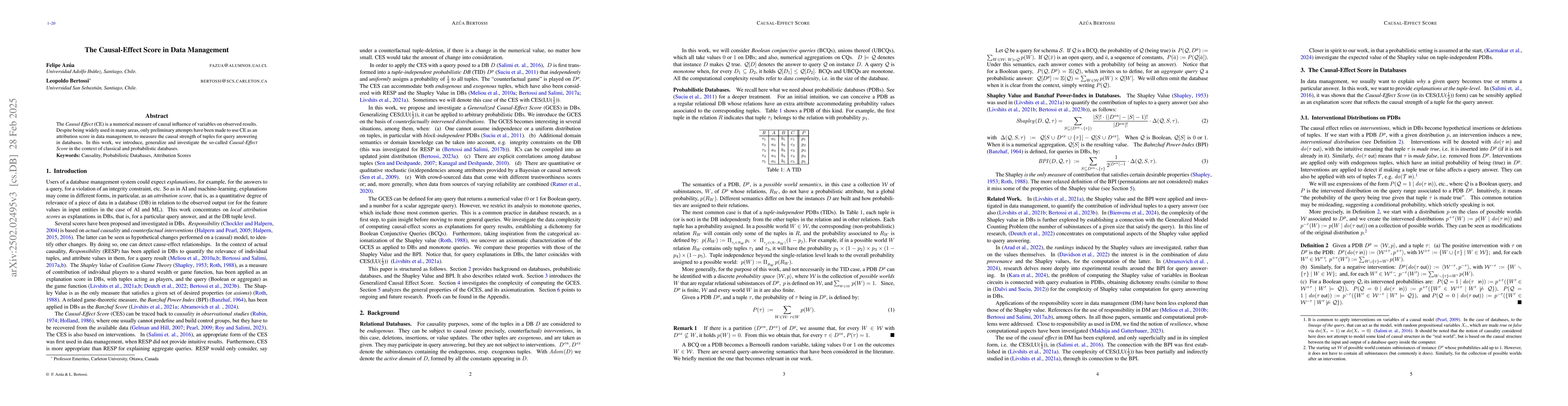 The paper introduces and investigates the Causal-Effect Score (CE) in classical and probabilistic databases, aiming to measure the causal strength of tuples for query answering.