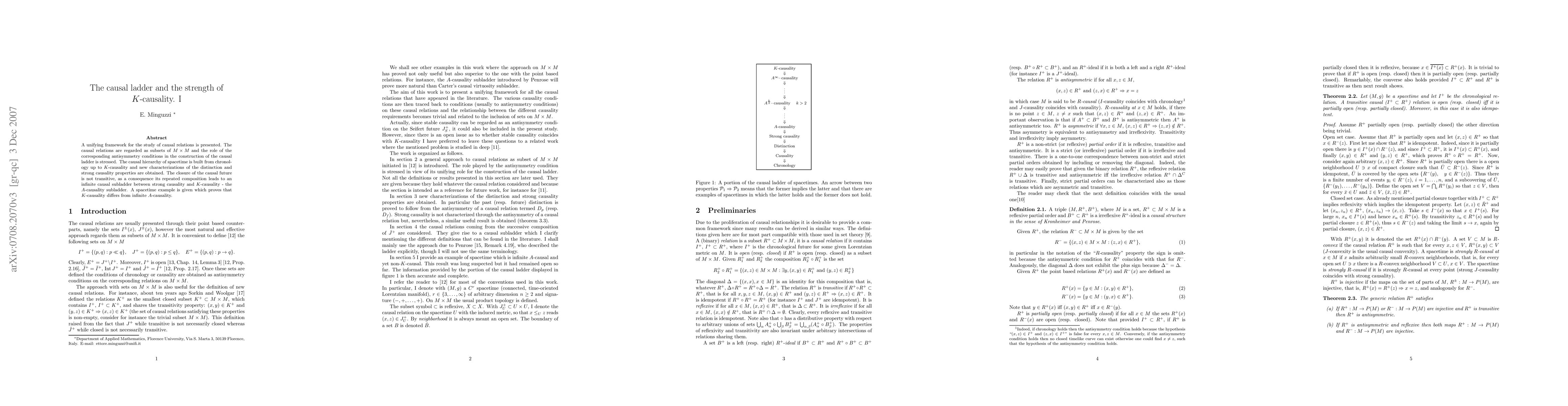A unifying framework for the study of causal relations is presented. The causal relations are regarded as subsets of M x M and the role of the corresponding antisymmetry conditions in the construction of the causal ladder is stressed. The causal hierarchy of spacetime is built from chronology up to K-causality and new characterizations of the distinction and strong causality properties are obtained. The closure of the causal future is not transitive, as a consequence its repeated composition leads to an infinite causal subladder between strong causality and K-causality - the A-causality subladder. A spacetime example is given which proves that K-causality differs from infinite A-causality.