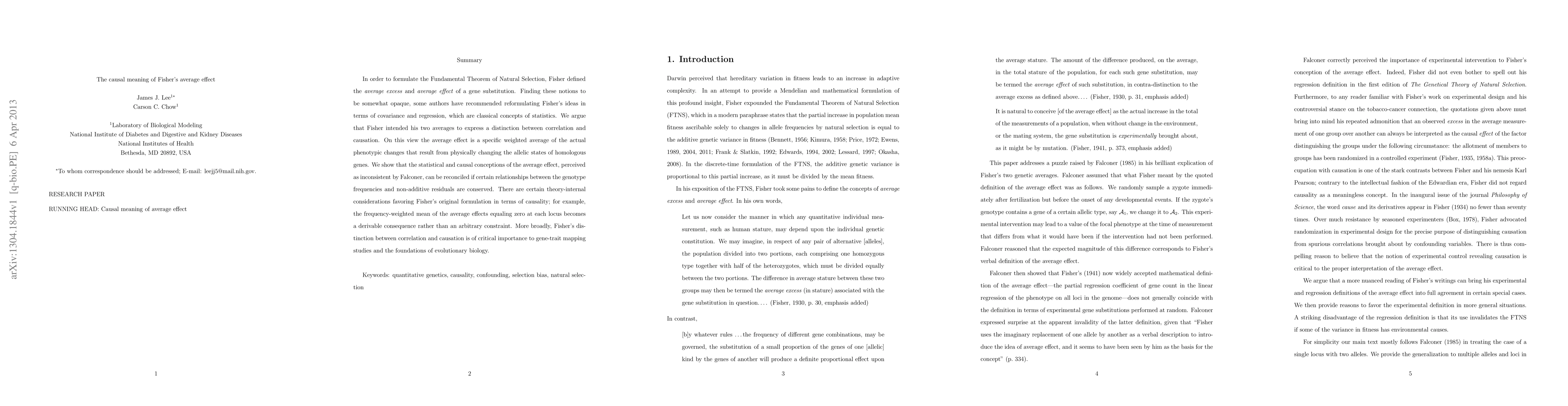 In order to formulate the Fundamental Theorem of Natural Selection, Fisher defined the average excess and average effect of a gene substitution. Finding these notions to be somewhat opaque, some authors have recommended reformulating Fisher's ideas in terms of covariance and regression, which are classical concepts of statistics. We argue that Fisher intended his two averages to express a distinction between correlation and causation. On this view the average effect is a specific weighted average of the actual phenotypic changes that result from physically changing the allelic states of homologous genes. We show that the statistical and causal conceptions of the average effect, perceived as inconsistent by Falconer, can be reconciled if certain relationships between the genotype frequencies and non-additive residuals are conserved. There are certain theory-internal considerations favoring Fisher's original formulation in terms of causality; for example, the frequency-weighted mean of the average effects equaling zero at each locus becomes a derivable consequence rather than an arbitrary constraint. More broadly, Fisher's distinction between correlation and causation is of critical importance to gene-trait mapping studies and the foundations of evolutionary biology.