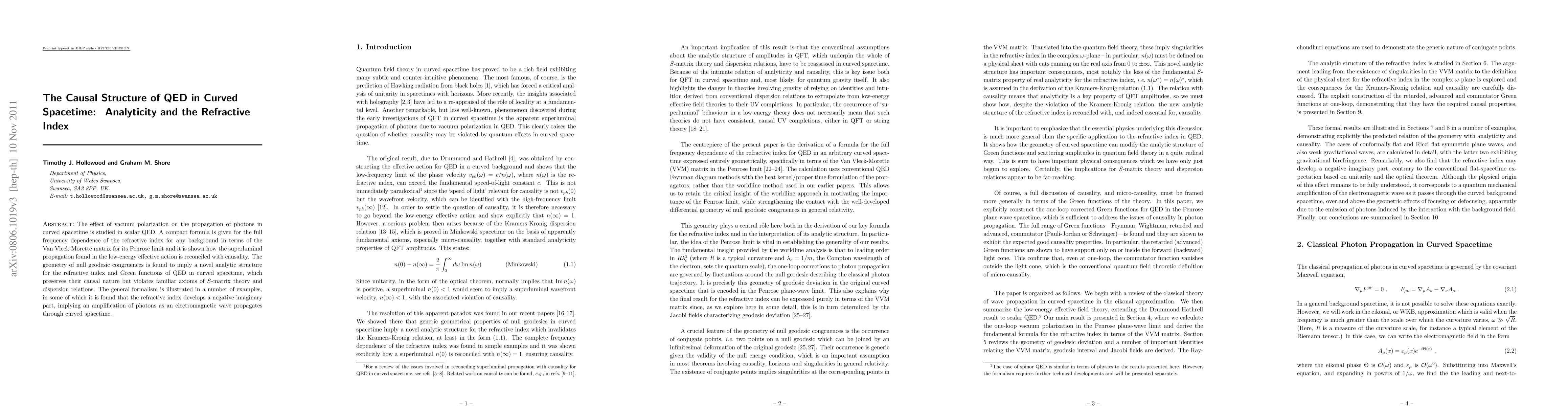 This paper studies vacuum polarization's effect on photon propagation in curved spacetime within scalar QED, deriving a formula for the refractive index's frequency dependence. It reconciles superluminal propagation with causality, revealing a novel analytic structure that preserves causal integrity despite violating S-matrix theory axioms.