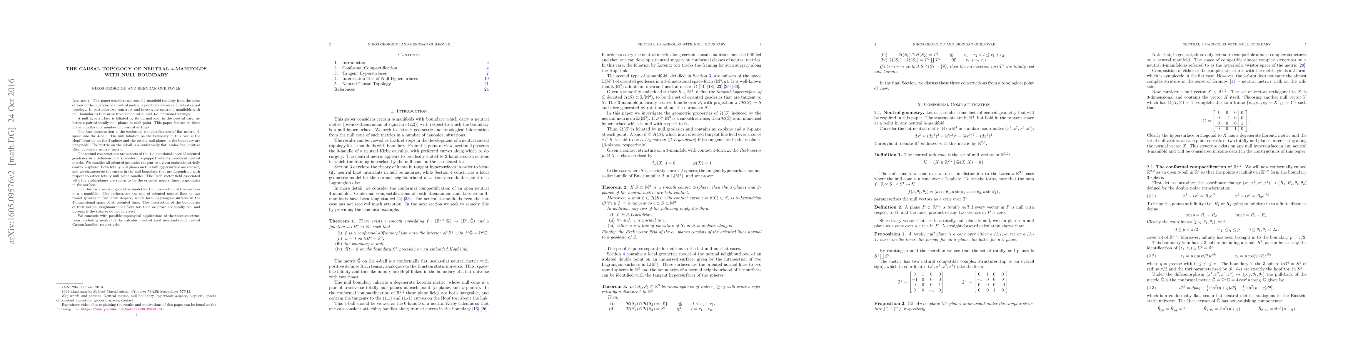 This paper explores neutral causal topology in 4-manifolds with null boundaries, constructing and analyzing three specific neutral 4-manifolds. It includes the conformal compactification of flat neutral 4-space, subsets of oriented geodesics in space-forms, and intersections of Lagrangian surfaces in a 4-manifold, concluding with potential topological applications.