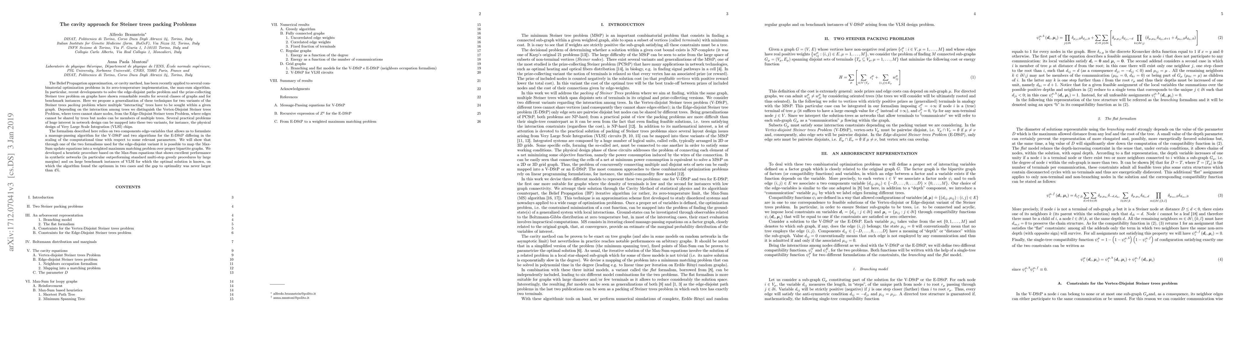 This paper proposes a cavity method for solving two variants of the Steiner trees packing problem: vertex-disjoint and edge-disjoint. The approach outperforms standard methods on synthetic networks and large VLSI benchmark instances, achieving optimal solutions or gaps to optimality under 4%.