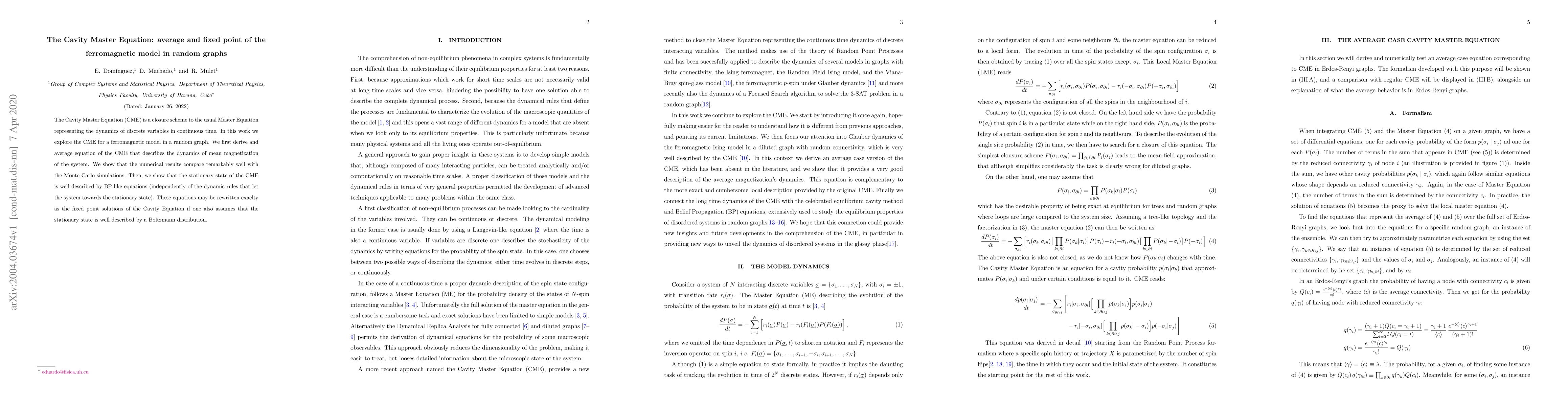 The Cavity Master Equation (CME) is a closure scheme to the usual Master Equation representing the dynamics of discrete variables in continuous time. In this work we explore the CME for a ferromagnetic model in a random graph. We first derive and average equation of the CME that describes the dynamics of mean magnetization of the system. We show that the numerical results compare remarkably well with the Monte Carlo simulations. Then, we show that the stationary state of the CME is well described by BP-like equations (independently of the dynamic rules that let the system towards the stationary state). These equations may be rewritten exactly as the fixed point solutions of the Cavity Equation if one also assumes that the stationary state is well described by a Boltzmann distribution.