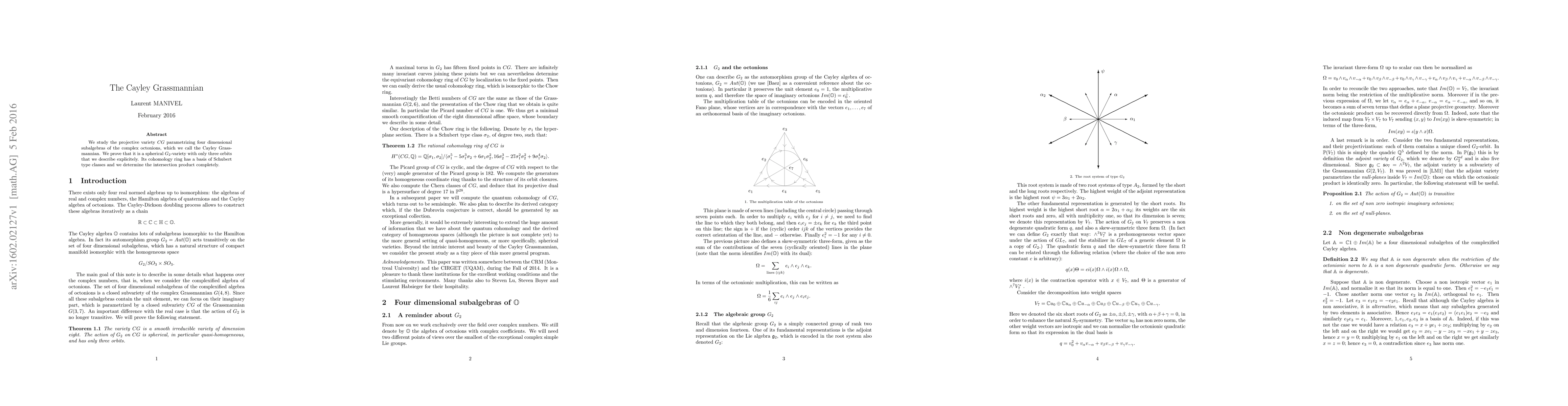 The Cayley Grassmannian is a projective variety that parametrizes four-dimensional subalgebras of complex octonions, with proven properties as a spherical G2-variety and explicit orbits.