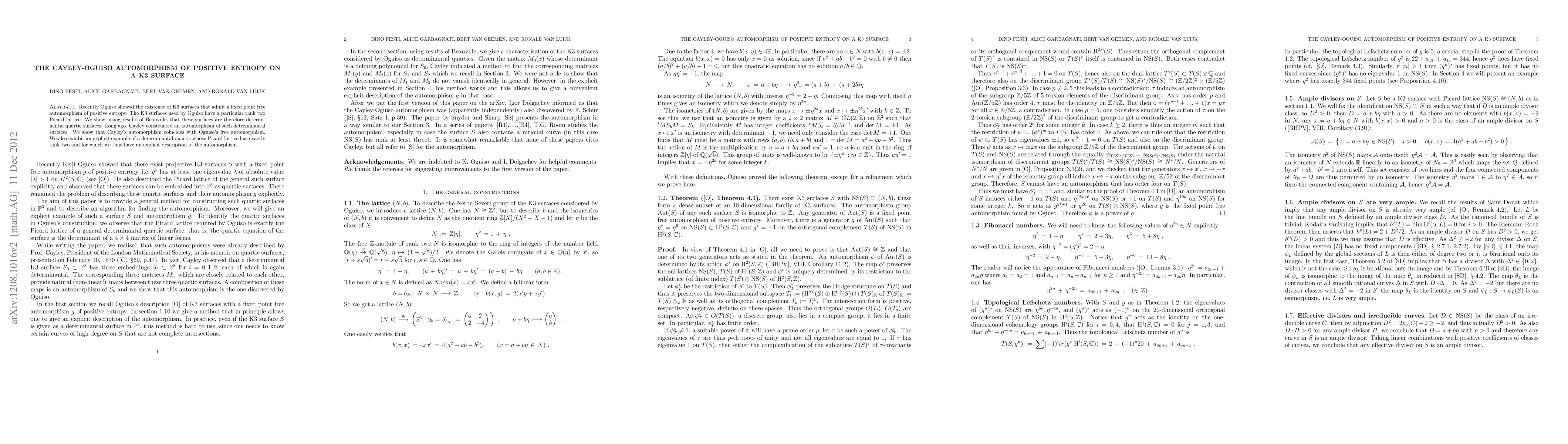 Recently Oguiso showed the existence of K3 surfaces that admit a fixed point free automorphism of positive entropy. The K3 surfaces used by Oguiso have a particular rank two Picard lattice. We show, using results of Beauville, that these surfaces are therefore determinantal quartic surfaces. Long ago, Cayley constructed an automorphism of such determinantal surfaces. We show that Cayley's automorphism coincides with Oguiso's free automorphism. We also exhibit an explicit example of a determinantal quartic whose Picard lattice has exactly rank two and for which we thus have an explicit description of the automorphism.