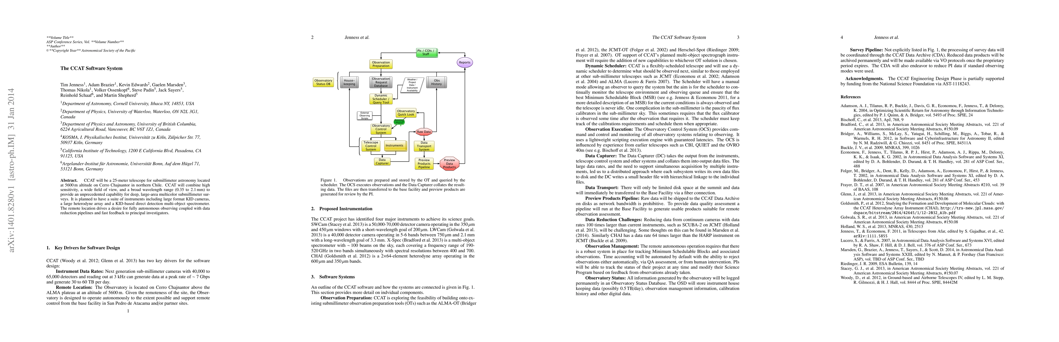 CCAT will be a 25-meter telescope for sub millimeter astronomy located at 5600m altitude on Cerro Chajnantor in northern Chile. CCAT will combine high sensitivity, a wide field of view, and a broad wavelength range (0.35 to 2.1mm) to provide an unprecedented capability for deep, large-area multicolor submillimeter surveys. It is planned to have a suite of instruments including large format KID cameras, a large heterodyne array and a KID-based direct detection multi-object spectrometer. The remote location drives a desire for fully autonomous observing coupled with data reduction pipelines and fast feedback to principal investigators.
