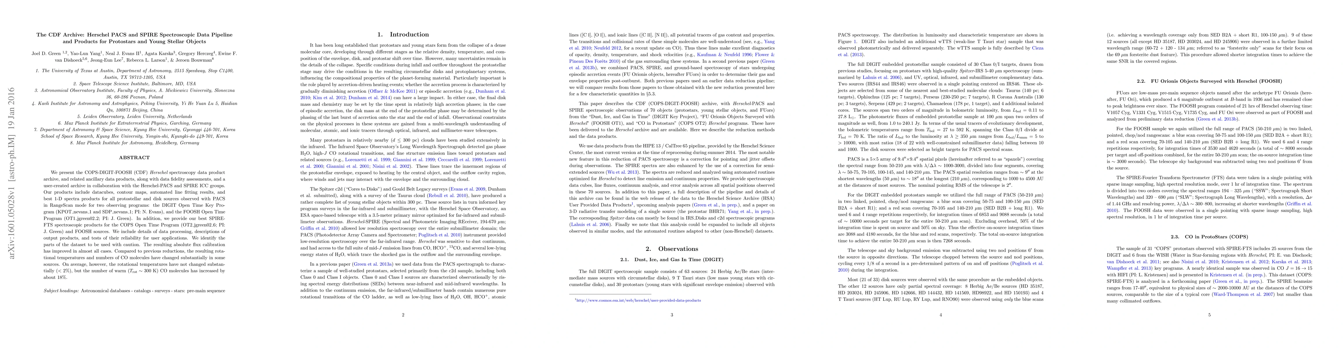 This paper introduces the CDF Archive, a comprehensive collection of Herschel PACS and SPIRE spectroscopic data products for protostars and young stellar objects, including datacubes, contour maps, and automated line fitting results. The archive has improved flux calibration and provides reliable data for user applications, though some results show significant changes in rotational temperatures and CO molecule numbers.